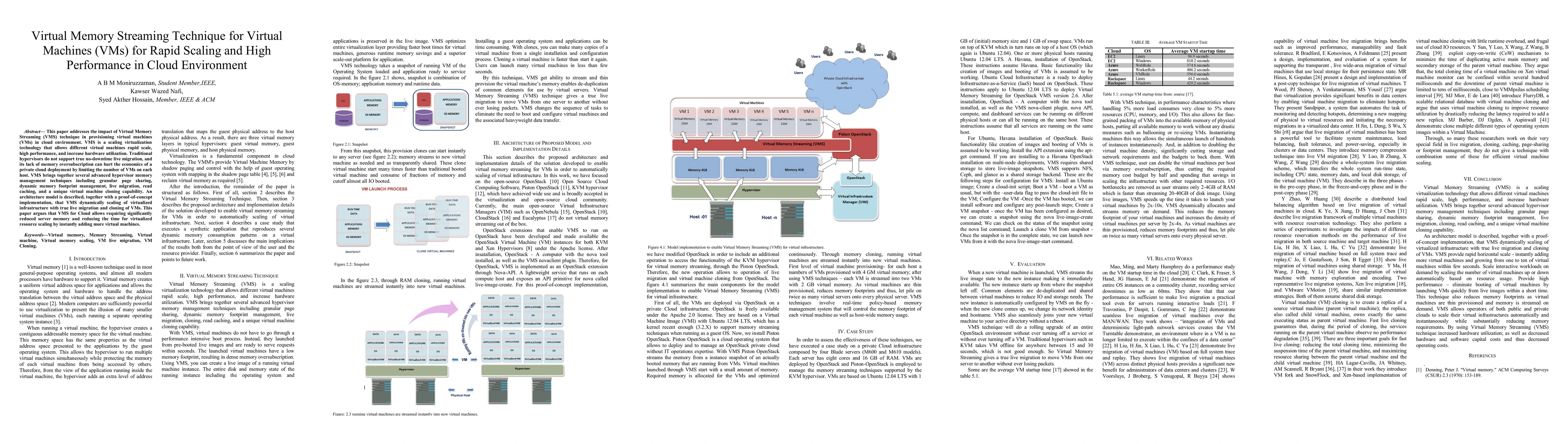 This paper introduces the Virtual Memory Streaming (VMS) technique for enhancing virtual machine scaling and performance in cloud environments, featuring advanced memory management and live migration. The VMS approach significantly reduces server memory requirements and scaling time by enabling true live migration and cloning of VMs.