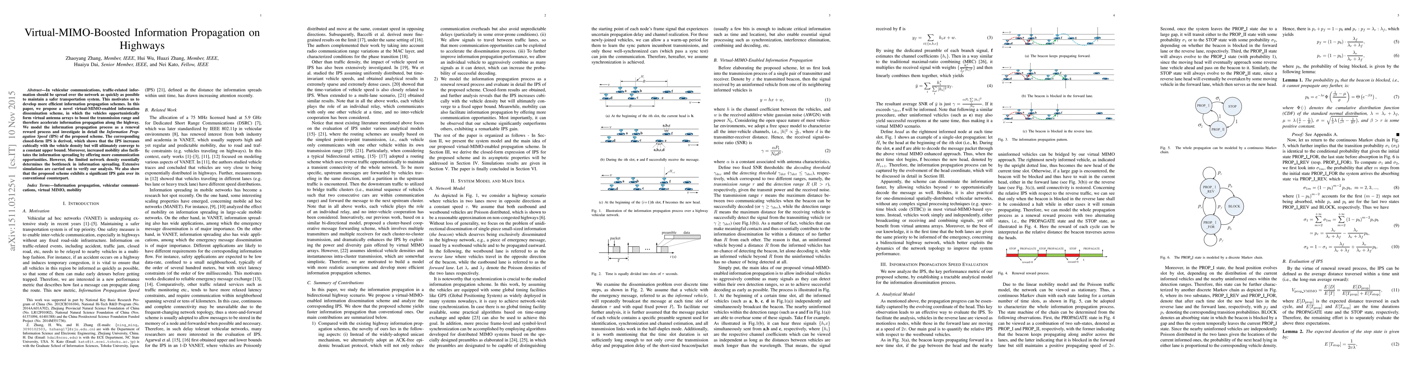 In vehicular communications, traffic-related information should be spread over the network as quickly as possible to maintain a safer transportation system. This motivates us to develop more efficient information propagation schemes. In this paper, we propose a novel virtual-MIMO-enabled information dissemination scheme, in which the vehicles opportunistically form virtual antenna arrays to boost the transmission range and therefore accelerate information propagation along the highway. We model the information propagation process as a renewal reward process and investigate in detail the \emph{Information Propagation Speed} (IPS) of the proposed scheme. The corresponding closed-form IPS is derived, which shows that the IPS increases cubically with the vehicle density but will ultimately converge to a constant upper bound. Moreover, increased mobility also facilitates the information spreading by offering more communication opportunities. However, the limited network density essentially determines the bottleneck in information spreading. Extensive simulations are carried out to verify our analysis. We also show that the proposed scheme exhibits a significant IPS gain over its conventional counterpart.