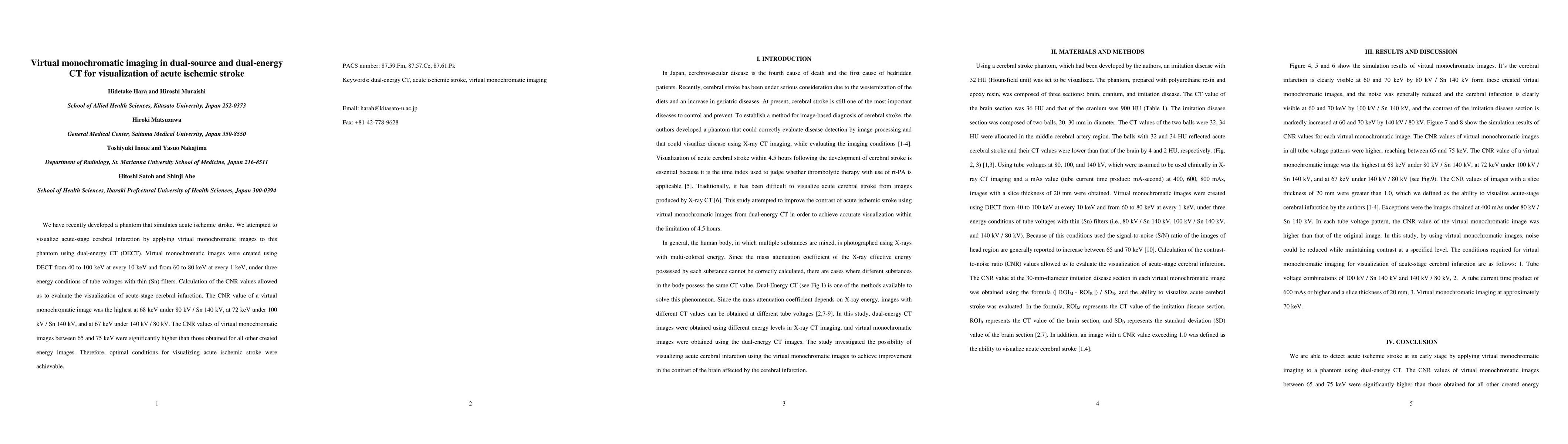 We have recently developed a phantom that simulates acute ischemic stroke. We attempted to visualize acute-stage cerebral infarction by applying virtual monochromatic images to this phantom using dual-energy CT (DECT). Virtual monochromatic images were created using DECT from 40 to 100 keV at every 10 keV and from 60 to 80 keV at every 1 keV, under three energy conditions of tube voltages with thin (Sn) filters. Calculation of the CNR values allowed us to evaluate the visualization of acute-stage cerebral infarction. The CNR value of a virtual monochromatic image was the highest at 68 keV under 80 kV / Sn 140 kV, at 72 keV under 100 kV / Sn 140 kV, and at 67 keV under 140 kV / 80 kV. The CNR values of virtual monochromatic images between 65 and 75 keV were significantly higher than those obtained for all other created energy images. Therefore, optimal conditions for visualizing acute ischemic stroke were achievable.