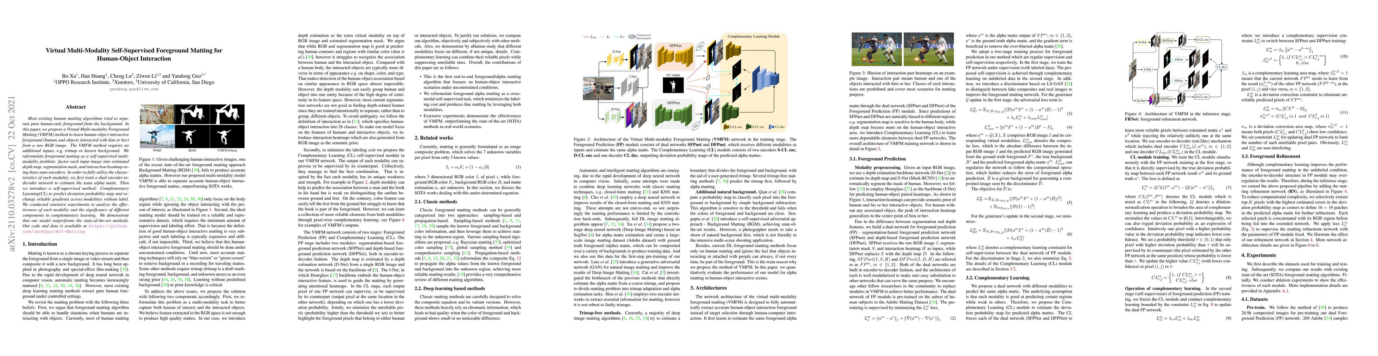 Most existing human matting algorithms tried to separate pure human-only foreground from the background. In this paper, we propose a Virtual Multi-modality Foreground Matting (VMFM) method to learn human-object interactive foreground (human and objects interacted with him or her) from a raw RGB image. The VMFM method requires no additional inputs, e.g. trimap or known background. We reformulate foreground matting as a self-supervised multi-modality problem: factor each input image into estimated depth map, segmentation mask, and interaction heatmap using three auto-encoders. In order to fully utilize the characteristics of each modality, we first train a dual encoder-to-decoder network to estimate the same alpha matte. Then we introduce a self-supervised method: Complementary Learning(CL) to predict deviation probability map and exchange reliable gradients across modalities without label. We conducted extensive experiments to analyze the effectiveness of each modality and the significance of different components in complementary learning. We demonstrate that our model outperforms the state-of-the-art methods.