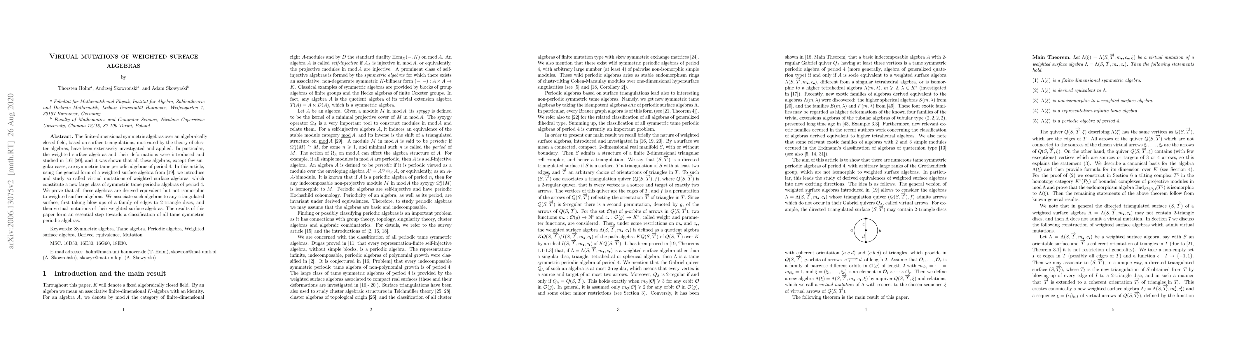 The finite-dimensional symmetric algebras over an algebraically closed field, based on surface triangulations, motivated by the theory of cluster algebras, have been extensively investigated and applied. In particular, the weighted surface algebras and their deformations were introduced and studied in [16]-[20], and it was shown that all these algebras, except few singular cases, are symmetric tame periodic algebras of period $4$. In this article, using the general form of a weighted surface algebra from [19], we introduce and study so called virtual mutations of weighted surface algebras, which constitute a new large class of symmetric tame periodic algebras of period $4$. We prove that all these algebras are derived equivalent but not isomorphic to weighted surface algebras. We associate such algebras to any triangulated surface, first taking blow-ups of a family of edges to $2$-triangle discs, and then virtual mutations of their weighted surface algebras. The results of this paper form an essential step towards a classification of all tame symmetric periodic algebras.