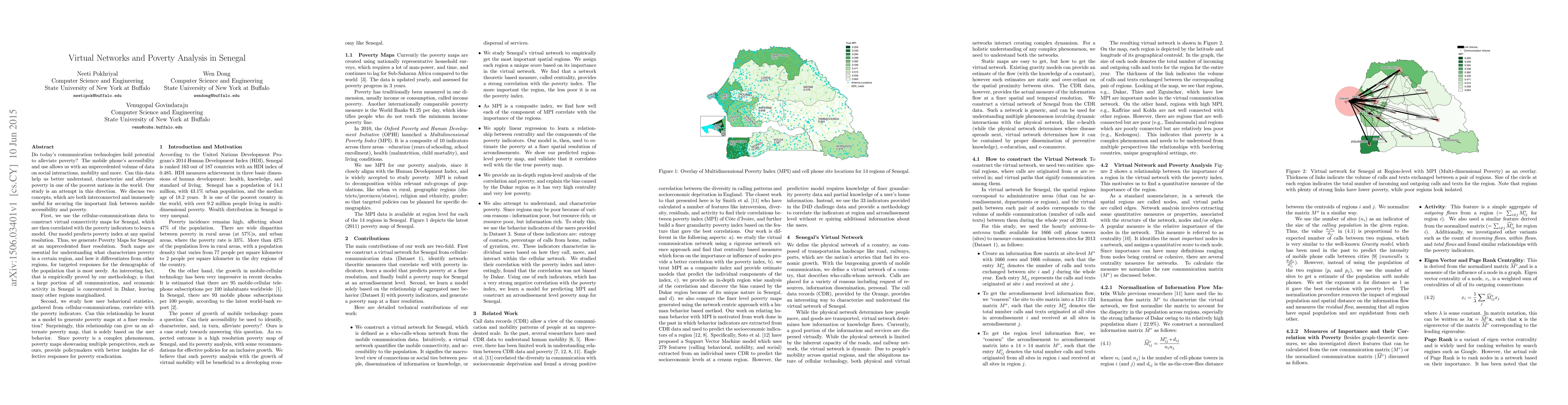 Do today's communication technologies hold potential to alleviate poverty? The mobile phone's accessibility and use allows us with an unprecedented volume of data on social interactions, mobility and more. Can this data help us better understand, characterize and alleviate poverty in one of the poorest nations in the world. Our study is an attempt in this direction. We discuss two concepts, which are both interconnected and immensely useful for securing the important link between mobile accessibility and poverty. First, we use the cellular-communications data to construct virtual connectivity maps for Senegal, which are then correlated with the poverty indicators to learn a model. Our model predicts poverty index at any spatial resolution. Thus, we generate Poverty Maps for Senegal at an unprecedented finer resolution. Such maps are essential for understanding what characterizes poverty in a certain region, and how it differentiates from other regions, for targeted responses for the demographic of the population that is most needy. An interesting fact, that is empirically proved by our methodology, is that a large portion of all communication, and economic activity in Senegal is concentrated in Dakar, leaving many other regions marginalized. Second, we study how user behavioral statistics, gathered from cellular-communications, correlate with the poverty indicators. Can this relationship be learnt as a model to generate poverty maps at a finer resolution? Surprisingly, this relationship can give us an alternate poverty map, that is solely based on the user behavior. Since poverty is a complex phenomenon, poverty maps showcasing multiple perspectives, such as ours, provide policymakers with better insights for effective responses for poverty eradication.