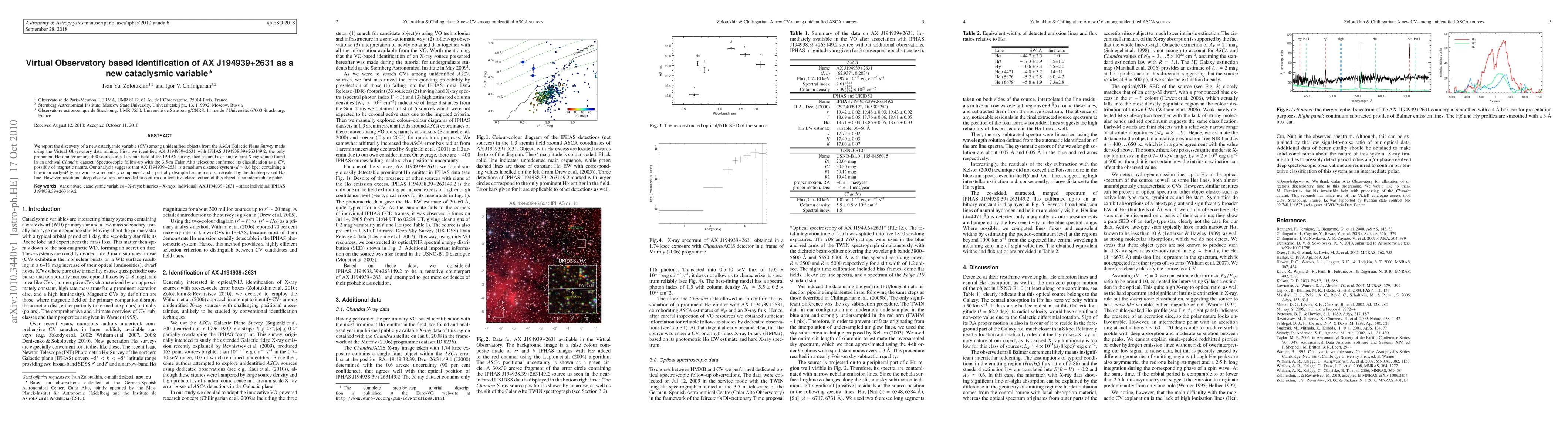 The research identifies AX J194939+2631 as a new cataclysmic variable (CV) using Virtual Observatory data mining. It was linked to IPHAS J194938.39+263149.2, confirmed as a faint X-ray source in Chandra data, and classified as a CV, possibly magnetic, with a late-K or early-M type dwarf secondary and a disrupted accretion disc.