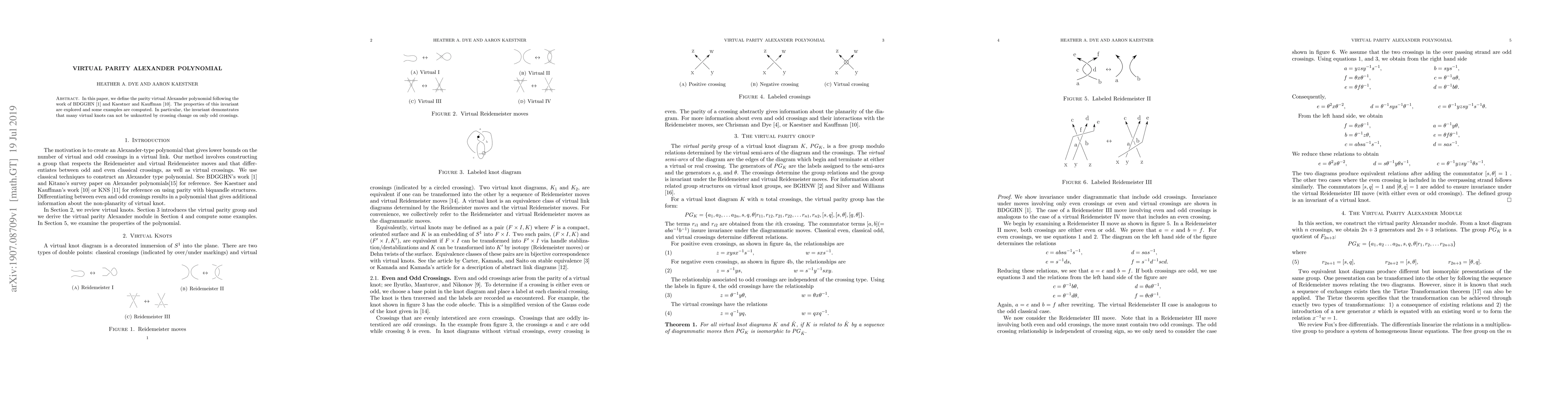 Summary: This paper introduces the parity virtual Alexander polynomial, building on prior work, and examines its properties and applications. It reveals that certain virtual knots cannot be simplified by changing only odd crossings.