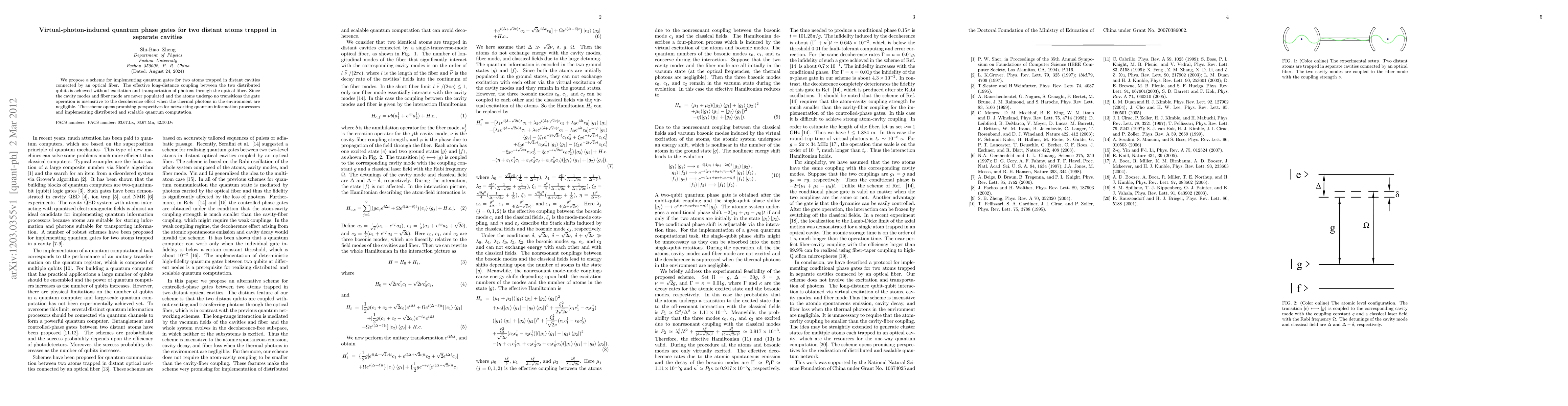 This paper proposes a method for implementing quantum gates between two distant atoms in separate cavities connected via an optical fiber, utilizing virtual photons to achieve long-distance coupling without photon excitation or transportation, thus mitigating decoherence and enabling scalable quantum computation.