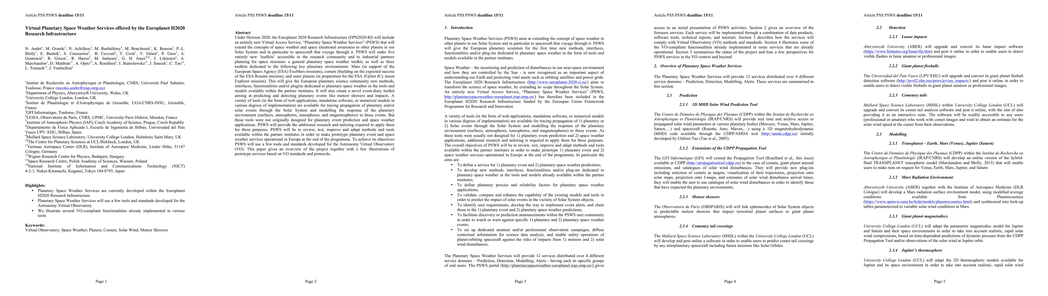The Europlanet 2020 Research Infrastructure will include new Planetary Space Weather Services (PSWS) that will extend the concepts of space weather and space situational awareness to other planets in our Solar System and in particular to spacecraft that voyage through it. PSWS will make five entirely new toolkits accessible to the research community and to industrial partners planning for space missions: a general planetary space weather toolkit, as well as three toolkits dedicated to the following key planetary environments: Mars, comets, and outer planets. This will give the European planetary science community new methods, interfaces, functionalities and/or plugins dedicated to planetary space weather in the tools and models available within the partner institutes. It will also create a novel event-diary toolkit aiming at predicting and detecting planetary events like meteor showers and impacts. A variety of tools are available for tracing propagation of planetary and/or solar events through the Solar System and modelling the response of the planetary environment (surfaces, atmospheres, ionospheres, and magnetospheres) to those events. But these tools were not originally designed for planetary event prediction and space weather applications. PSWS will provide the additional research and tailoring required to apply them for these purposes. PSWS will be to review, test, improve and adapt methods and tools available within the partner institutes in order to make prototype planetary event and space weather services operational in Europe at the end of the programme. To achieve its objectives PSWS will use a few tools and standards developed for the Astronomy Virtual Observatory (VO). This paper gives an overview of the project together with a few illustrations of prototype services based on VO standards and protocols.