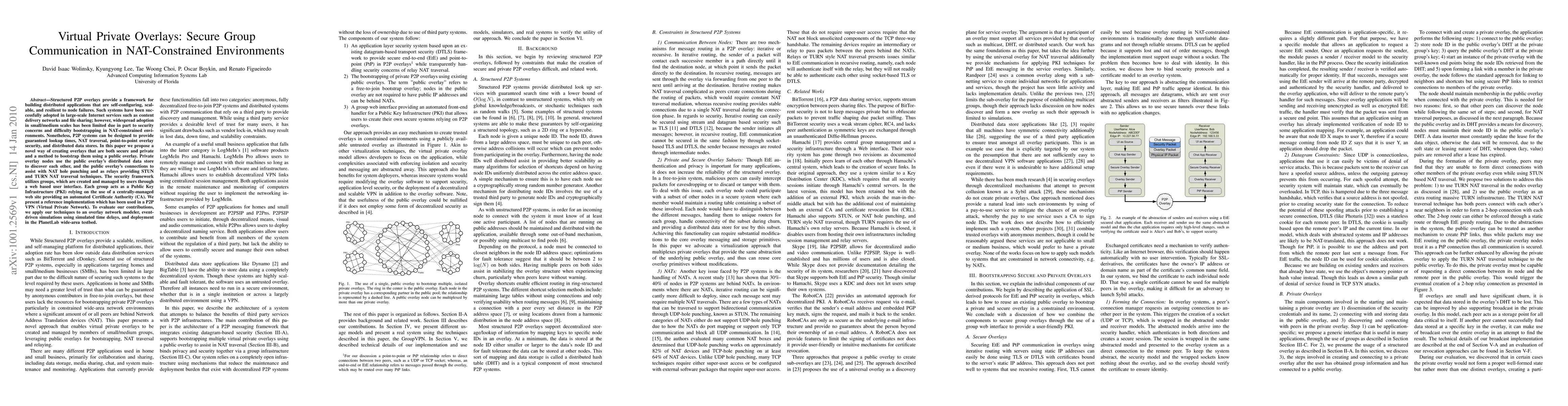 This paper proposes a secure and private method for creating structured P2P overlays that facilitate NAT traversal and bootstrapping in NAT-constrained environments, using a public overlay for discovery and NAT hole punching. The security framework relies on user-managed groups and a centralized Certificate Authority for PKI.