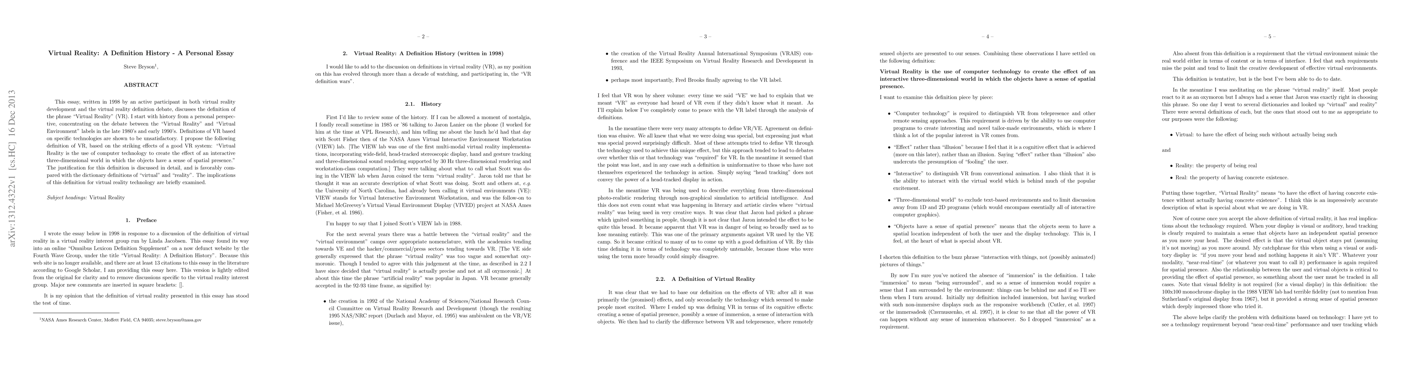 This 1998 essay by a key figure in virtual reality (VR) explores the historical debate over VR versus virtual environment labels, arguing that technology-based definitions are insufficient. The author proposes a definition of VR as creating an interactive, three-dimensional world with spatially present objects, emphasizing its striking effects.