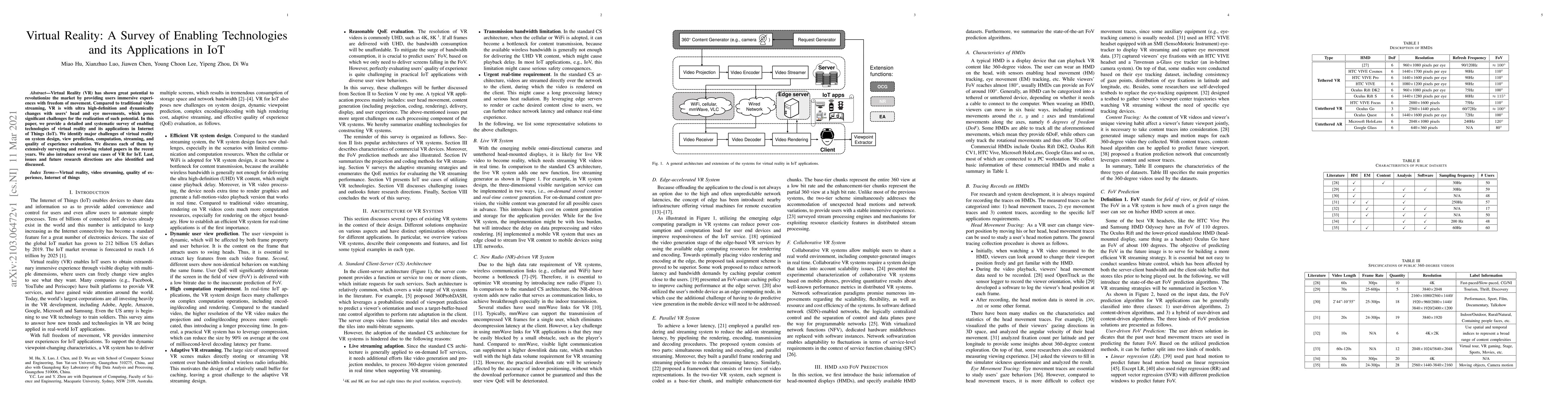 This paper provides a comprehensive survey of the enabling technologies for virtual reality (VR) and its applications within the Internet of Things (IoT). It identifies and discusses major challenges in system design, view prediction, computation, streaming, and quality of experience evaluation, and presents several VR use cases in IoT. Future research directions are also outlined.