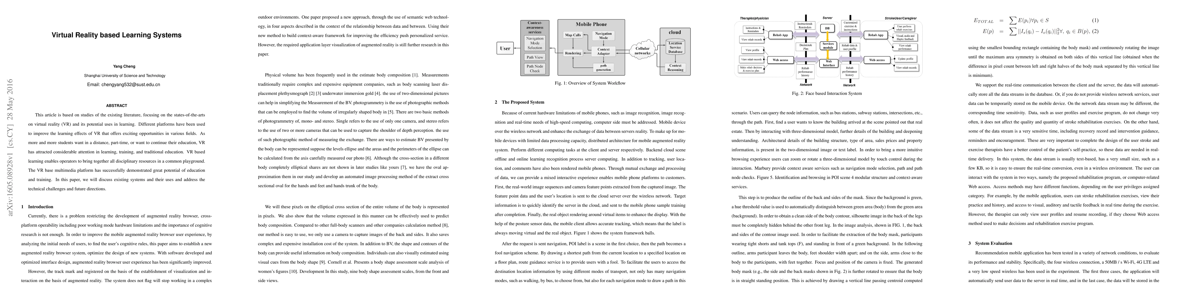 This article is based on studies of the existing literature, focusing on the states-of-the-arts on virtual reality (VR) and its potential uses in learning. Different platforms have been used to improve the learning effects of VR that offers exciting opportunities in various fields. As more and more students want in a distance, part-time, or want to continue their education, VR has attracted considerable attention in learning, training, and traditional education. VR based learning enables operators to bring together all disciplinary resources in a common playground. The VR base multimedia platform has successfully demonstrated great potential of education and training. In this paper, we will discuss existing systems and their uses and address the technical challenges and future directions.