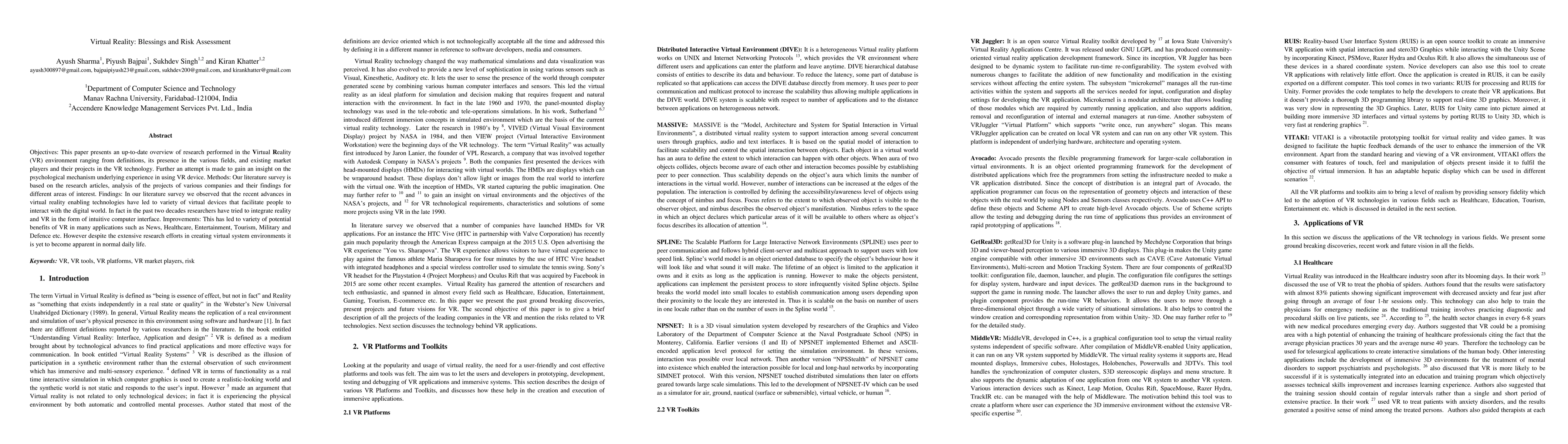 Objectives: This paper presents an up-to-date overview of research performed in the Virtual Reality (VR) environment ranging from definitions, its presence in the various fields, and existing market players and their projects in the VR technology. Further an attempt is made to gain an insight on the psychological mechanism underlying experience in using VR device. Methods: Our literature survey is based on the research articles, analysis of the projects of various companies and their findings for different areas of interest. Findings: In our literature survey we observed that the recent advances in virtual reality enabling technologies have led to variety of virtual devices that facilitate people to interact with the digital world. In fact in the past two decades researchers have tried to integrate reality and VR in the form of intuitive computer interface. Improvements: This has led to variety of potential benefits of VR in many applications such as News, Healthcare, Entertainment, Tourism, Military and Defence etc. However despite the extensive research efforts in creating virtual system environments it is yet to become apparent in normal daily life.