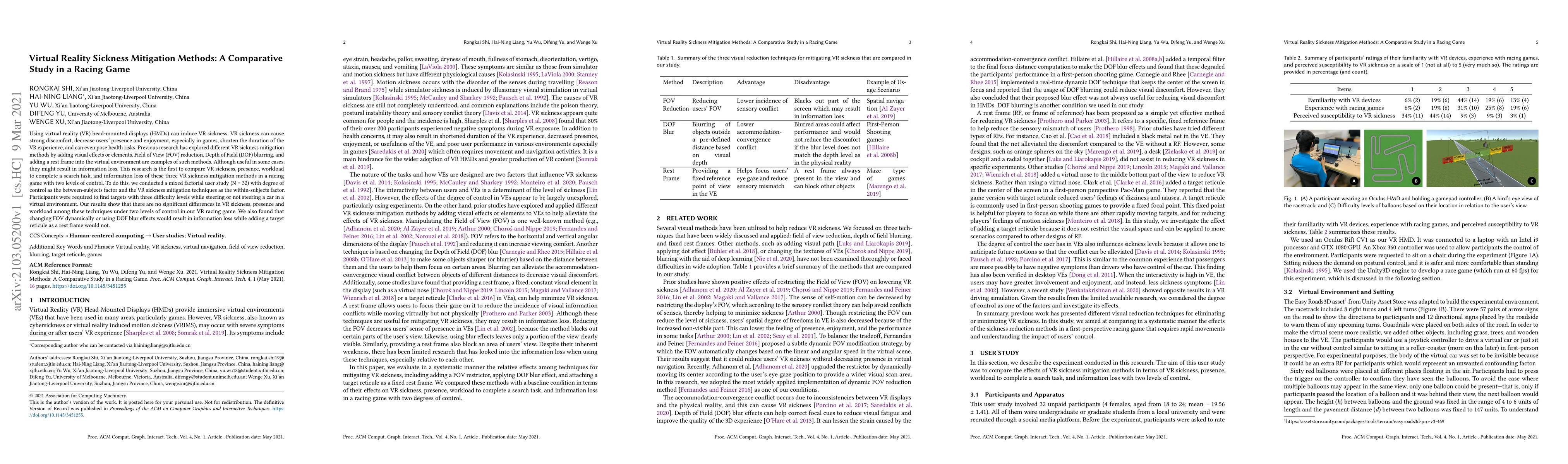 This research compares three VR sickness mitigation methods—FOV reduction, DOF blurring, and a rest frame—in a racing game, finding no significant differences in VR sickness, presence, or workload among them. Notably, dynamic FOV changes and DOF blur cause information loss, unlike the rest frame.