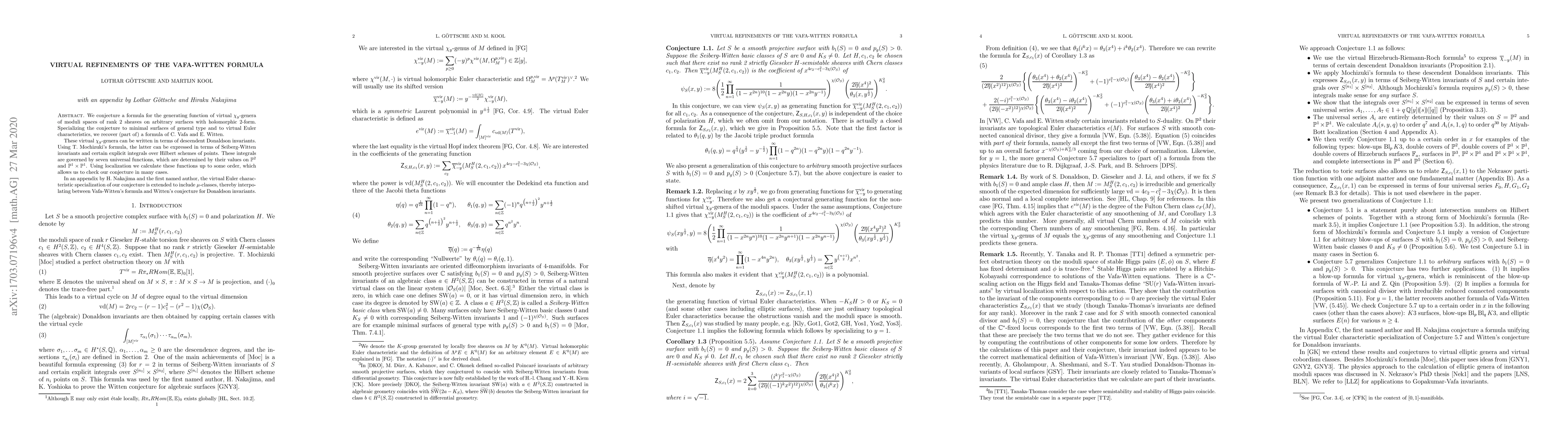 We conjecture a formula for the generating function of virtual $\chi_y$-genera of moduli spaces of rank 2 sheaves on arbitrary surfaces with holomorphic 2-form. Specializing the conjecture to minimal surfaces of general type and to virtual Euler characteristics, we recover (part of) a formula of C. Vafa and E. Witten. These virtual $\chi_y$-genera can be written in terms of descendent Donaldson invariants. Using T. Mochizuki's formula, the latter can be expressed in terms of Seiberg-Witten invariants and certain explicit integrals over Hilbert schemes of points. These integrals are governed by seven universal functions, which are determined by their values on $\mathbb{P}^2$ and $\mathbb{P}^1 \times \mathbb{P}^1$. Using localization we calculate these functions up to some order, which allows us to check our conjecture in many cases. In an appendix by H. Nakajima and the first named author, the virtual Euler characteristic specialization of our conjecture is extended to include $\mu$-classes, thereby interpolating between Vafa-Witten's formula and Witten's conjecture for Donaldson invariants.