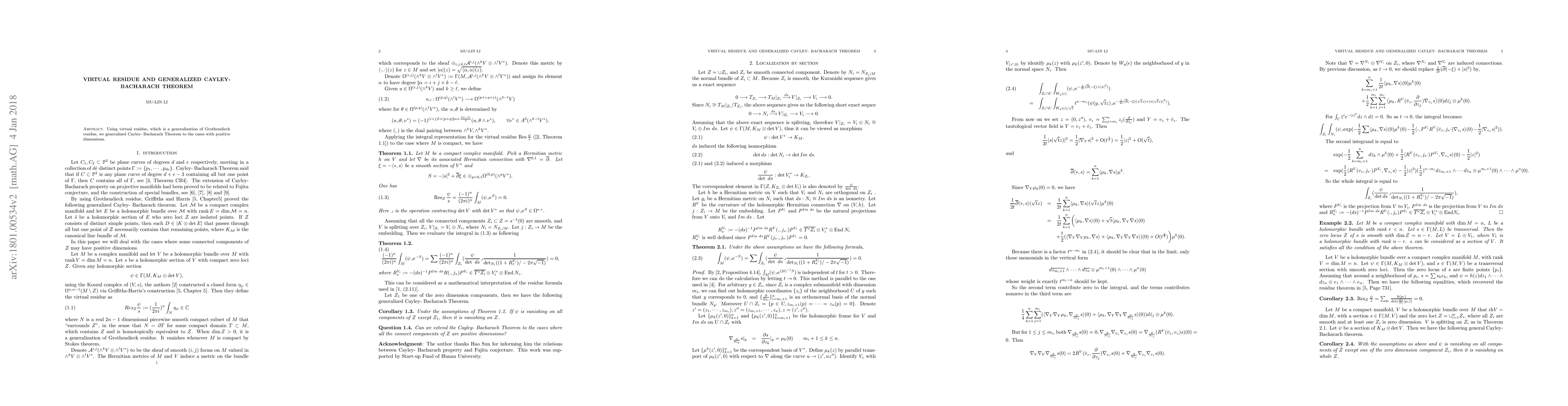 Summary: This paper generalizes the Cayley-Bacharach Theorem using virtual residue, a broader concept than Grothendieck's residue, to apply to cases with positive dimensions. The method extends the theorem's applicability beyond traditional constraints.