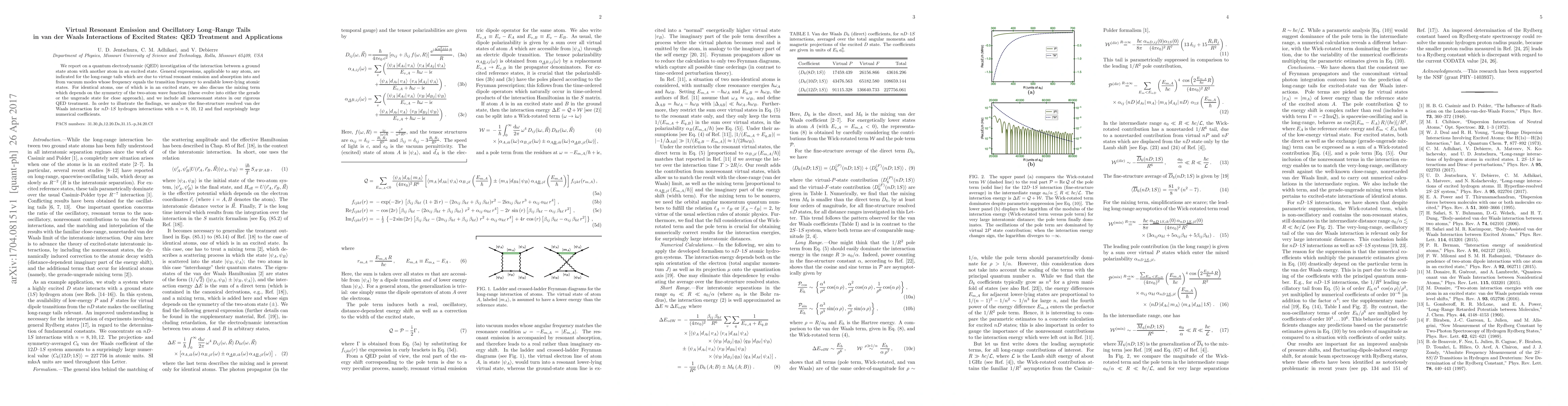 We report on a quantum electrodynamic (QED) investigation of the interaction between a ground state atom with another atom in an excited state. General expressions, applicable to any atom, are indicated for the long-range tails which are due to virtual resonant emission and absorption into and from vacuum modes whose frequency equals the transition frequency to available lower-lying atomic states. For identical atoms, one of which is in an excited state, we also discuss the mixing term which depends on the symmetry of the two-atom wave function (these evolve into either the gerade or the ungerade state for close approach), and we include all nonresonant states in our rigorous QED treatment. In order to illustrate the findings, we analyze the fine-structure resolved van der Waals interaction for nD-1S hydrogen interactions with n=8,10,12 and find surprisingly large numerical coefficients.