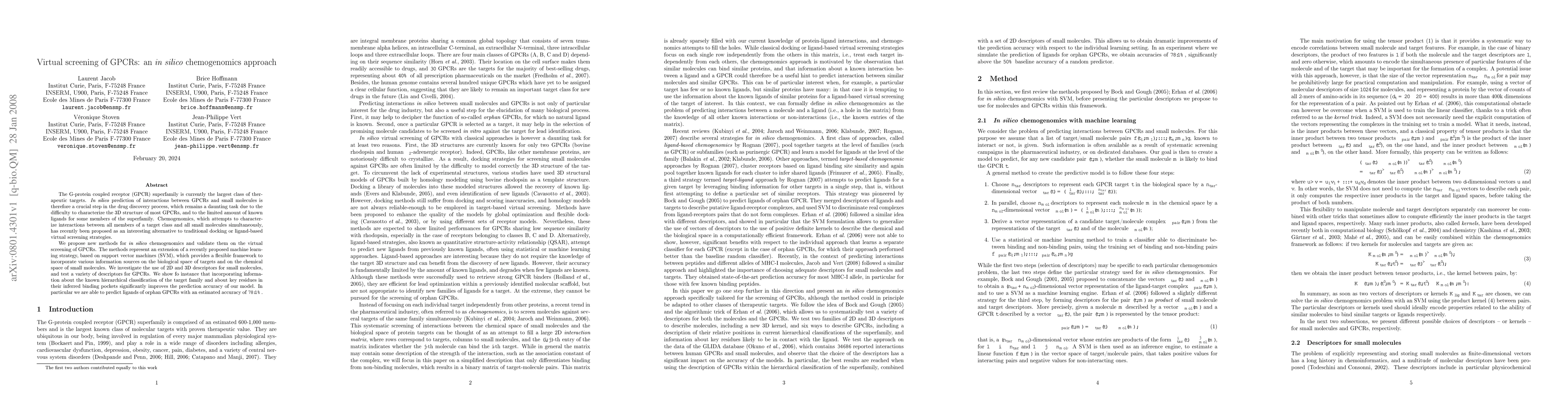 This paper proposes advanced in silico chemogenomics methods for virtual screening of GPCRs, extending machine learning strategies based on support vector machines. The methods incorporate diverse 2D and 3D descriptors and hierarchical classification data, achieving a prediction accuracy of 78.1% for orphan GPCRs.