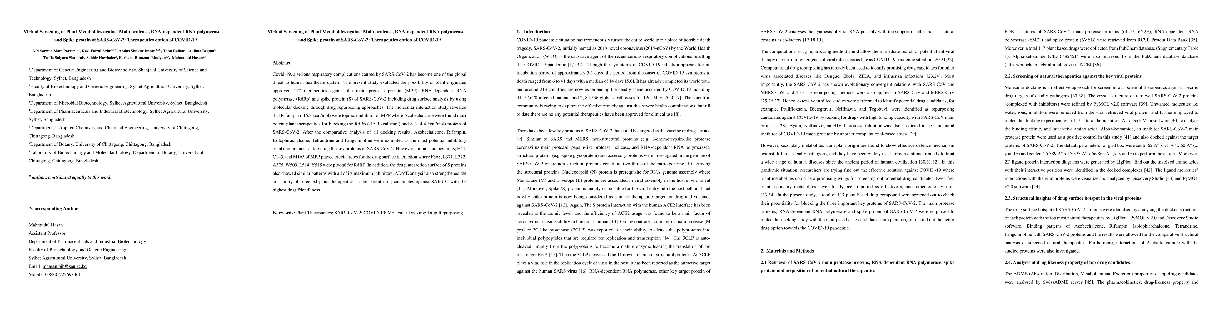 This study employs virtual screening and molecular docking to identify potential plant-based therapeutics against SARS-CoV-2's main protease, RNA-dependent RNA polymerase, and spike protein. Rifampin, Azobechalcone, Isolophirachalcone, Tetrandrine, and Fangchinoline emerged as the most promising inhibitors, with Azobechalcone showing strong efficacy against multiple viral proteins.