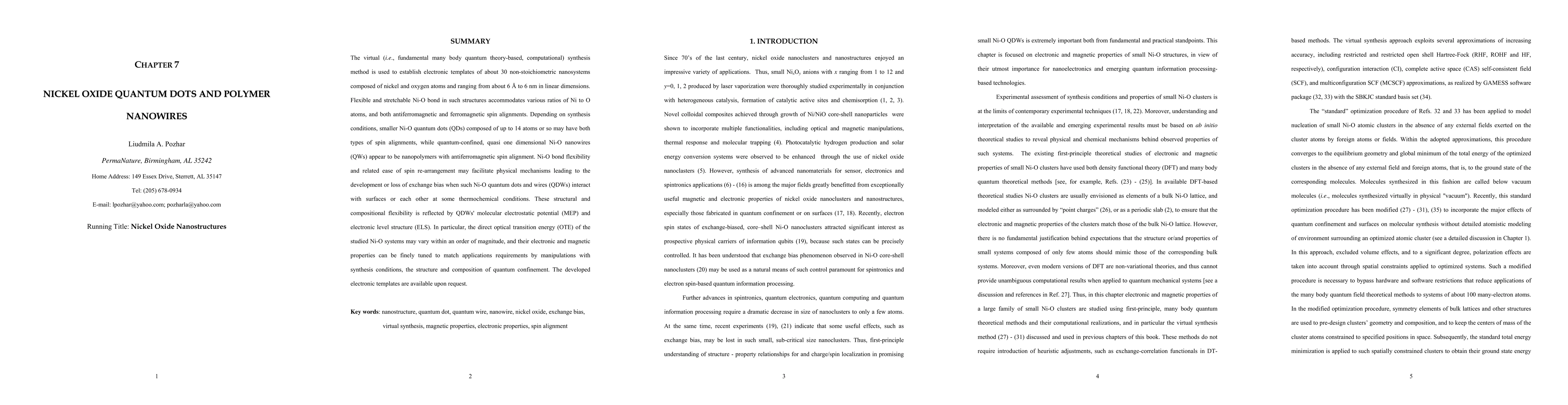 The virtual (i.e., fundamental many body quantum theory-based, computational) synthesis method is used to establish electronic templates of about 30 non-stoichiometric nanosystems composed of nickel and oxygen atoms and ranging from about 6 {\AA} to 6 nm in linear dimensions. Flexible and stretchable Ni-O bond in such structures accommodates various ratios of Ni to O atoms, and both antiferromagnetic and ferromagnetic spin alignments. Depending on synthesis conditions, smaller Ni-O quantum dots (QDs) composed of up to 14 atoms or so may have both types of spin alignments, while quantum-confined, quasi one dimensional Ni-O nanowires (QWs) appear to be nanopolymers with antiferromagnetic spin alignment. Ni-O bond flexibility and related ease of spin re-arrangement may facilitate physical mechanisms leading to the development or loss of exchange bias when such Ni-O quantum dots and wires (QDWs) interact with surfaces or each other at some thermochemical conditions. These structural and compositional flexibility is reflected by QDWs' molecular electrostatic potential (MEP) and electronic level structure (ELS). In particular, the direct optical transition energy (OTE) of the studied Ni-O systems may vary within an order of magnitude, and their electronic and magnetic properties can be finely tuned to match applications requirements by manipulations with synthesis conditions, the structure and composition of quantum confinement. The developed electronic templates are available upon request.