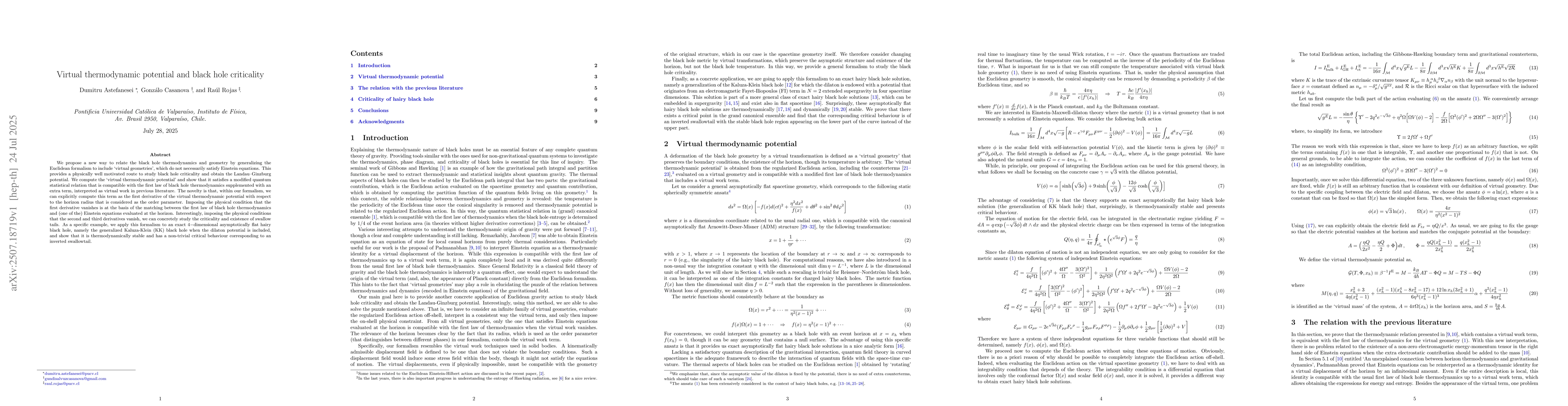 We propose a new way to relate the black hole thermodynamics and geometry by generalizing the Euclidean formalism to include "virtual geometries", which do not necessarily satisfy Einstein equations. This provides a physically well motivated route to study black hole criticality and obtain the Landau Ginzburg potential. We compute the "virtual thermodynamic potential" and show that it satisfies a modified quantum statistical relation that is compatible with the first law of black hole thermodynamics supplemented with an extra term, interpreted as virtual work in previous literature. The novelty is that, within our formalism, we can explicitly compute this term as the first derivative of the virtual thermodynamic potential with respect to the horizon radius that is considered as the order parameter. Imposing the physical condition that the first derivative vanishes is at the basis of the matching between the first law of black hole thermodynamics and (one of the) Einstein equations evaluated at the horizon. Interestingly, imposing the physical conditions that the second and third derivatives vanish, we can concretely study the criticality and existence of swallow tails. As a specific example, we apply this formalism to an exact four dimensional asymptotically flat hairy black hole, namely the generalized Kaluza Klein (KK) black hole when the dilaton potential is included, and show that it is thermodynamically stable and has a non-trivial critical behaviour corresponding to an inverted swallowtail.