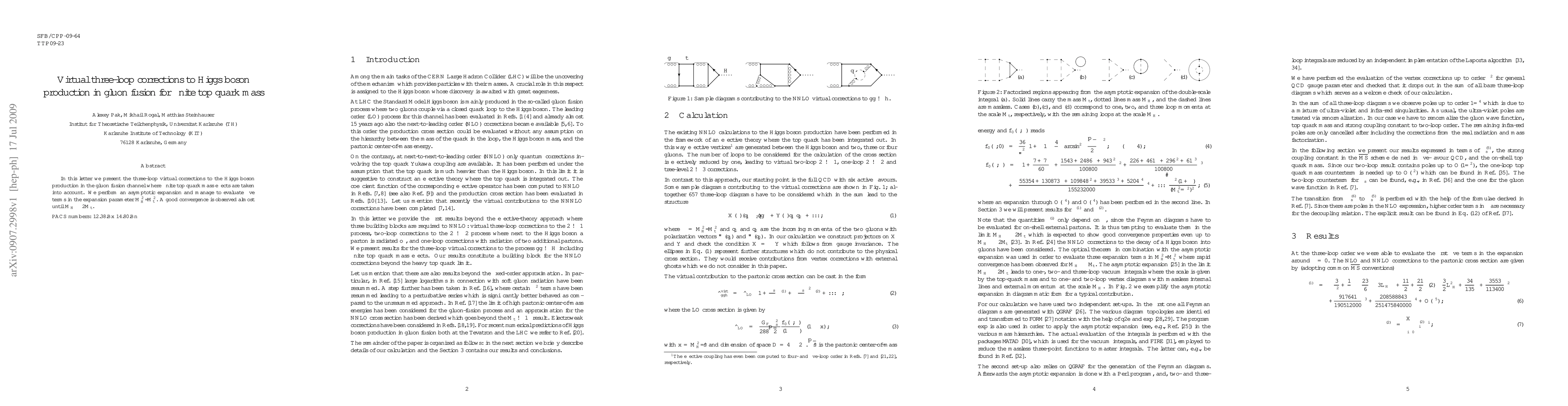 This paper presents three-loop virtual corrections for Higgs boson production via gluon fusion, considering finite top quark mass effects. The authors evaluate five terms in an asymptotic expansion, observing good convergence up to Higgs masses near twice the top quark mass.