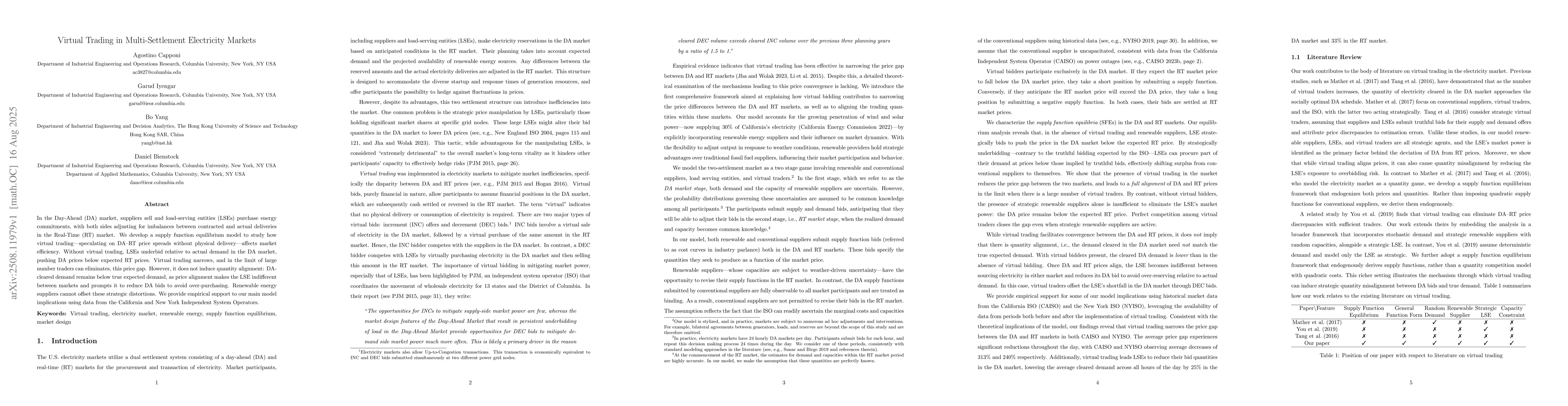 In the Day-Ahead (DA) market, suppliers sell and load-serving entities (LSEs) purchase energy commitments, with both sides adjusting for imbalances between contracted and actual deliveries in the Real-Time (RT) market. We develop a supply function equilibrium model to study how virtual trading-speculating on DA-RT price spreads without physical delivery-affects market efficiency. Without virtual trading, LSEs underbid relative to actual demand in the DA market, pushing DA prices below expected RT prices. Virtual trading narrows, and in the limit of large number traders can eliminates, this price gap. However, it does not induce quantity alignment: DA-cleared demand remains below true expected demand, as price alignment makes the LSE indifferent between markets and prompts it to reduce DA bids to avoid over-purchasing. Renewable energy suppliers cannot offset these strategic distortions. We provide empirical support to our main model implications using data from the California and New York Independent System Operators.