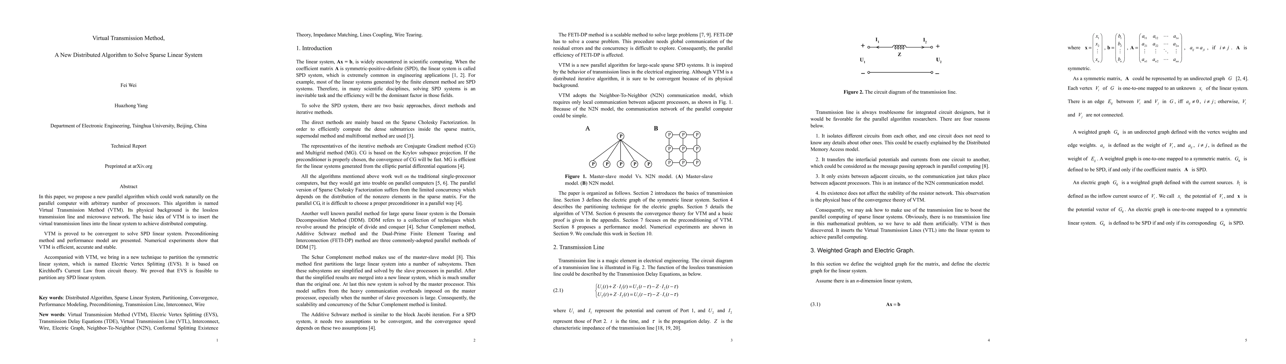 In this paper, we propose a new parallel algorithm which could work naturally on the parallel computer with arbitrary number of processors. This algorithm is named Virtual Transmission Method (VTM). Its physical backgroud is the lossless transmission line and microwave network. The basic idea of VTM is to insert lossless transmission lines into the sparse linear system to achieve distributed computing. VTM is proved to be convergent to solve SPD linear system. Preconditioning method and performance model are presented. Numerical experiments show that VTM is efficient, accurate and stable. Accompanied with VTM, we bring in a new technique to partition the symmetric linear system, which is named Generalized Node & Branch Tearing (GNBT). It is based on Kirchhoff's Current Law from circuit theory. We proved that GNBT is feasible to partition any SPD linear system.