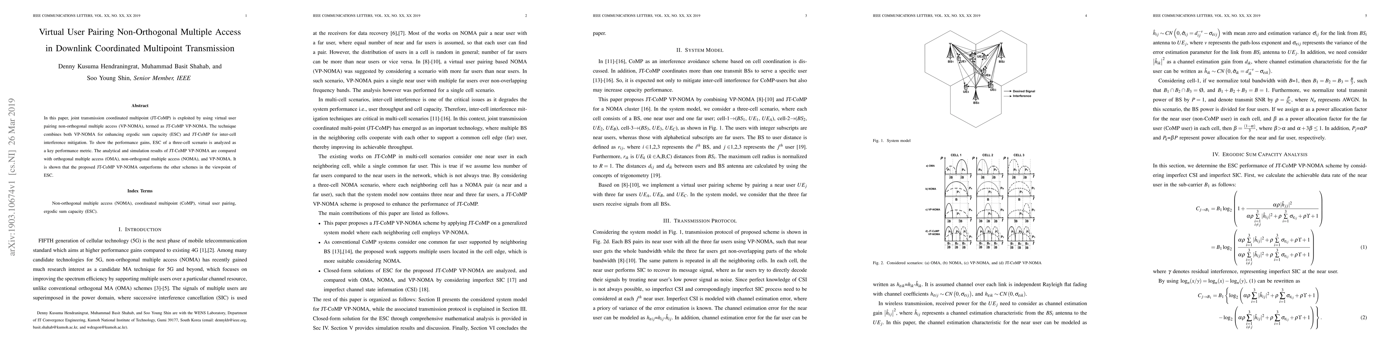 This paper proposes a joint transmission coordinated multipoint (JT-CoMP) technique using virtual user pairing non-orthogonal multiple access (VP-NOMA) to enhance ergodic sum capacity (ESC) and mitigate inter-cell interference. Analytical and simulation results show that JT-CoMP VP-NOMA outperforms orthogonal multiple access (OMA), NOMA, and VP-NOMA in terms of ESC.
