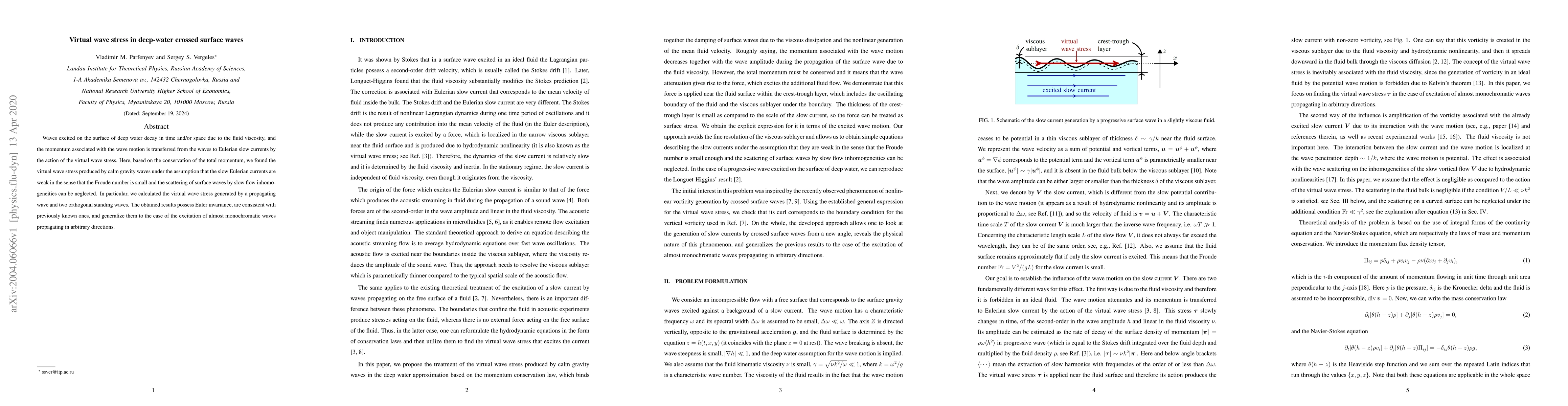 Waves excited on the surface of deep water decay in time and/or space due to the fluid viscosity, and the momentum associated with the wave motion is transferred from the waves to Eulerian slow currents by the action of the virtual wave stress. Here, based on the conservation of the total momentum, we found the virtual wave stress produced by calm gravity waves under the assumption that the slow Eulerian currents are weak in the sense that the Froude number is small and the scattering of surface waves by slow flow inhomogeneities can be neglected. In particular, we calculated the virtual wave stress generated by a propagating wave and two orthogonal standing waves. The obtained results possess Euler invariance, are consistent with previously known ones, and generalize them to the case of the excitation of almost monochromatic waves propagating in arbitrary directions.