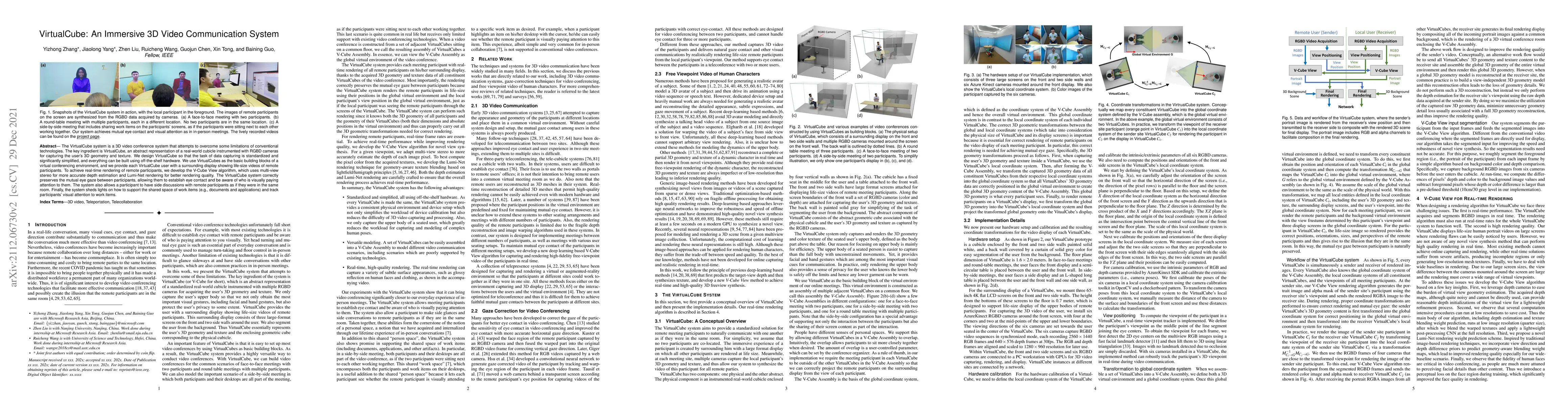 The VirtualCube system is a 3D video conference system that attempts to overcome some limitations of conventional technologies. The key ingredient is VirtualCube, an abstract representation of a real-world cubicle instrumented with RGBD cameras for capturing the 3D geometry and texture of a user. We design VirtualCube so that the task of data capturing is standardized and significantly simplified, and everything can be built using off-the-shelf hardware. We use VirtualCubes as the basic building blocks of a virtual conferencing environment, and we provide each VirtualCube user with a surrounding display showing life-size videos of remote participants. To achieve real-time rendering of remote participants, we develop the V-Cube View algorithm, which uses multi-view stereo for more accurate depth estimation and Lumi-Net rendering for better rendering quality. The VirtualCube system correctly preserves the mutual eye gaze between participants, allowing them to establish eye contact and be aware of who is visually paying attention to them. The system also allows a participant to have side discussions with remote participants as if they were in the same room. Finally, the system sheds lights on how to support the shared space of work items (e.g., documents and applications) and track the visual attention of participants to work items.