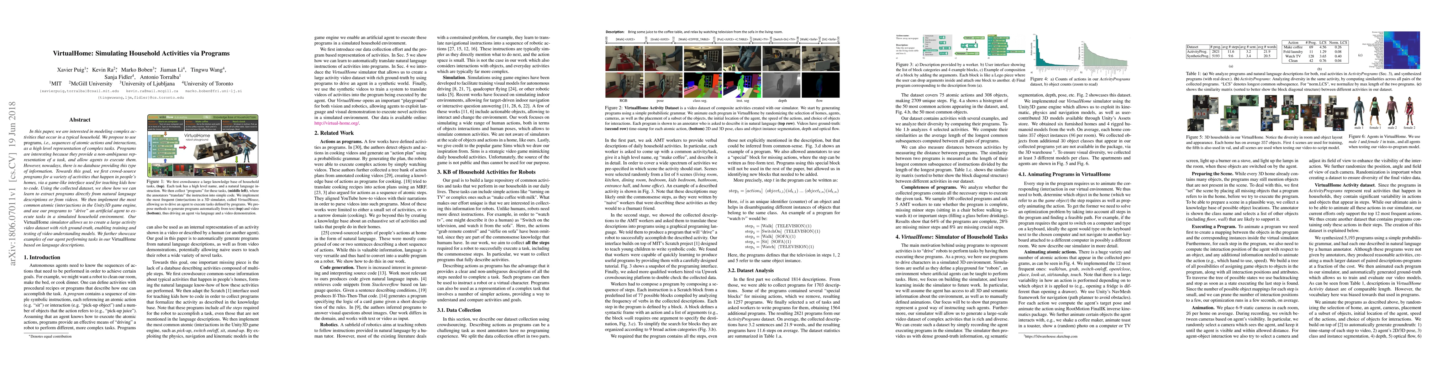 This paper introduces VirtualHome, a simulator for household activities using programs as high-level task representations. Programs are collected through crowd-sourcing via a coding game interface. The simulator, built in Unity3D, executes these programs to perform tasks, generating a video dataset for training video understanding models. It demonstrates an agent carrying out tasks based on language descriptions.