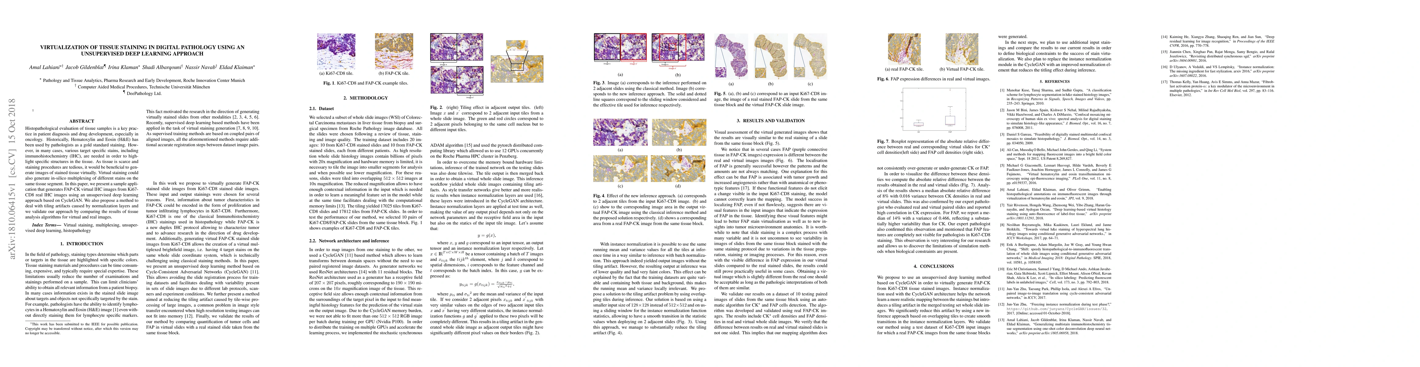 This paper introduces an unsupervised deep learning method using CycleGAN to virtually generate FAP-CK immunohistochemistry images from Ki67-CD8 real images, aiming to reduce the need for physical staining and enable in-silico multiplexing of tissue stains. The approach is validated by comparing tissue analysis algorithms on both virtual and real images.