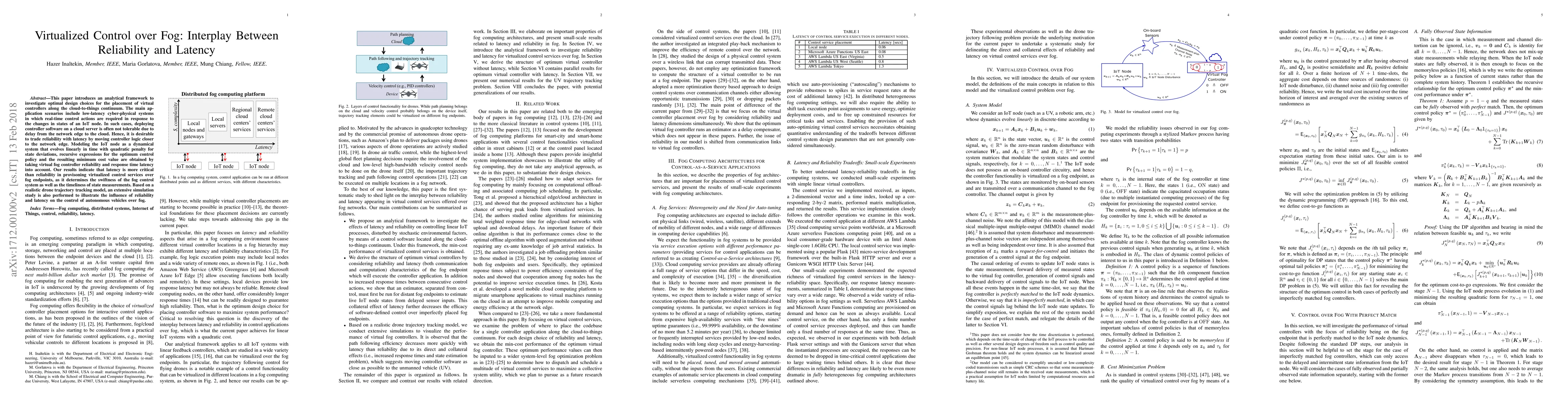 This paper introduces an analytical framework to investigate optimal design choices for the placement of virtual controllers along the cloud-to-things continuum. The main application scenarios include low-latency cyber-physical systems in which real-time control actions are required in response to the changes in states of an IoT node. In such cases, deploying controller software on a cloud server is often not tolerable due to delay from the network edge to the cloud. Hence, it is desirable to trade reliability with latency by moving controller logic closer to the network edge. Modeling the IoT node as a dynamical system that evolves linearly in time with quadratic penalty for state deviations, recursive expressions for the optimum control policy and the resulting minimum cost value are obtained by taking virtual fog controller reliability and response time latency into account. Our results indicate that latency is more critical than reliability in provisoning virtualized control services over fog endpoints, as it determines the swiftness of the fog control system as well as the timeliness of state measurements. Based on a realistic drone trajectory tracking model, an extensive simulation study is also performed to illustrate the influence of reliability and latency on the control of autonomous vehicles over fog.