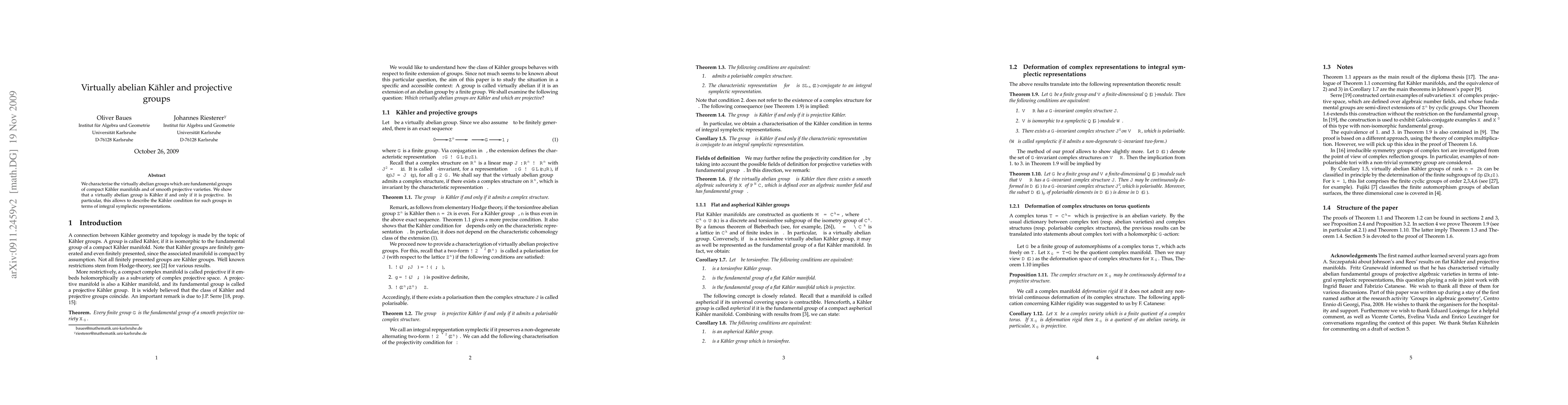 The paper characterizes virtually abelian groups that serve as fundamental groups for compact Kähler manifolds and smooth projective varieties, proving they are equivalent if the group is Kähler, and describing the Kähler condition through integral symplectic representations.