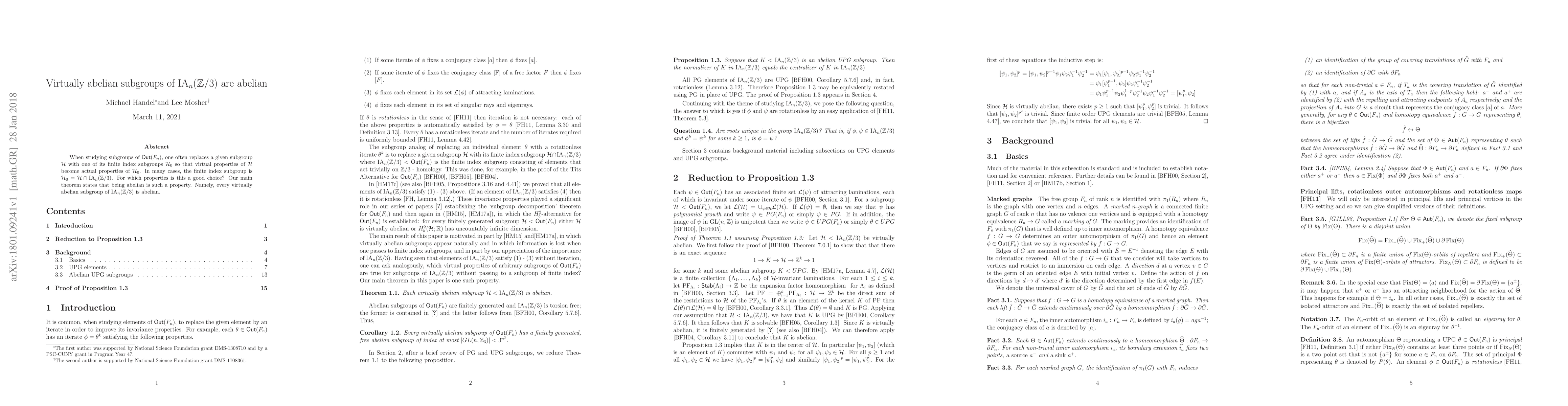 This paper demonstrates that every virtually abelian subgroup of the group $IA_n(Z/3)$ is actually abelian. The authors show that for studying properties of subgroups in $Out(F_n)$, the finite index subgroup $H_0 = H \cap IA_n(Z/3)$ is particularly useful when examining abelian properties.