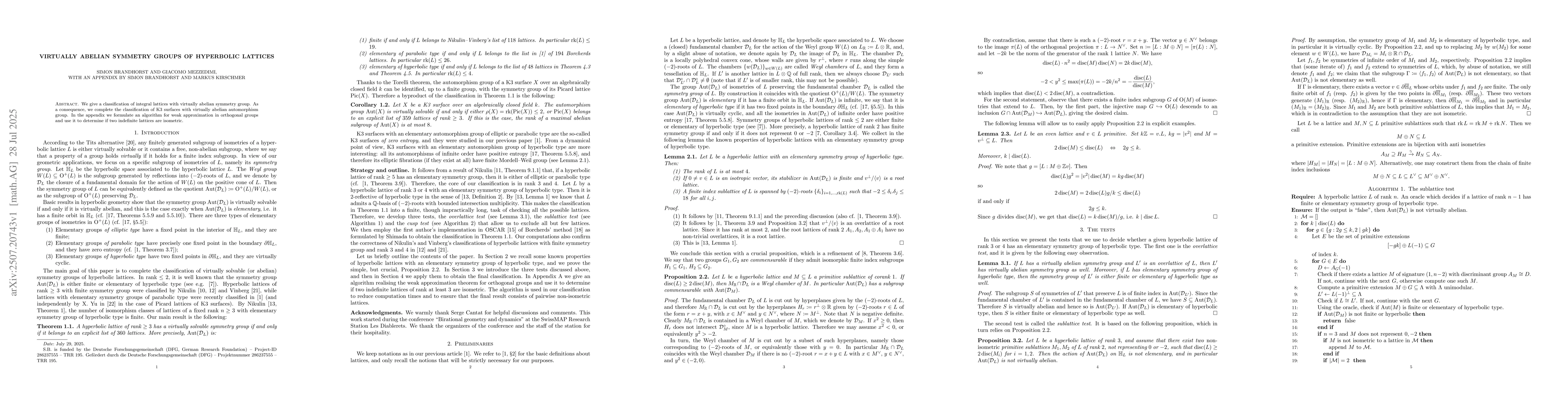 We give a classification of integral lattices with virtually abelian symmetry group. As a consequence, we complete the classification of K3 surfaces with virtually abelian automorphism group. In the appendix we formulate an algorithm for weak approximation in orthogonal groups and use it to determine if two indefinite lattices are isometric.