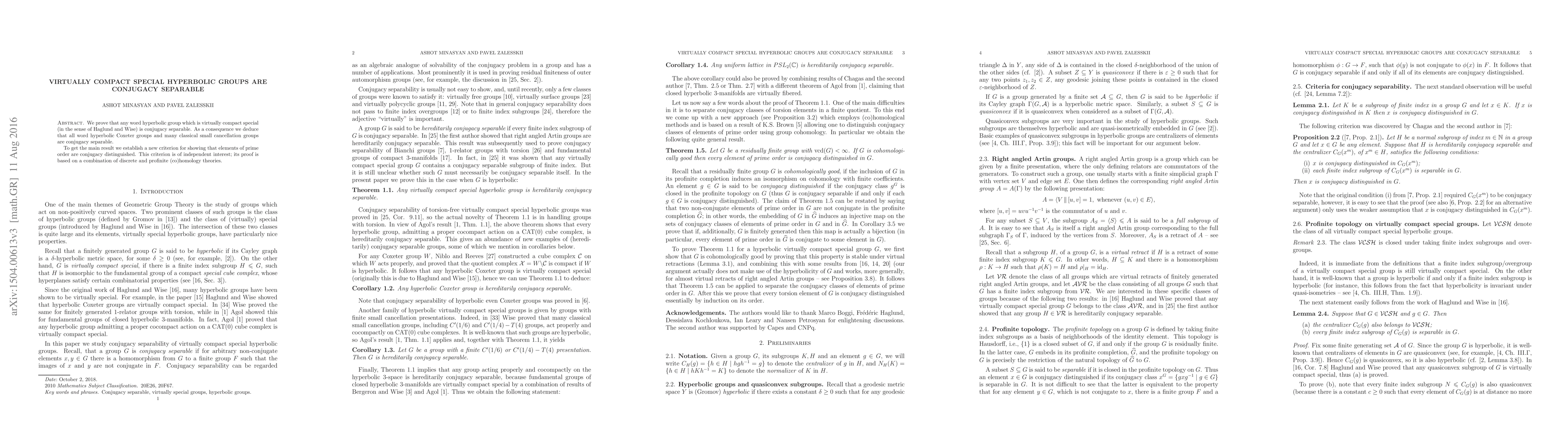 This paper proves that virtually compact special hyperbolic groups are conjugacy separable, establishing a new criterion for distinguishing elements of prime order using discrete and profinite (co)homology theories. The result extends to word hyperbolic Coxeter groups and many classical small cancellation groups.