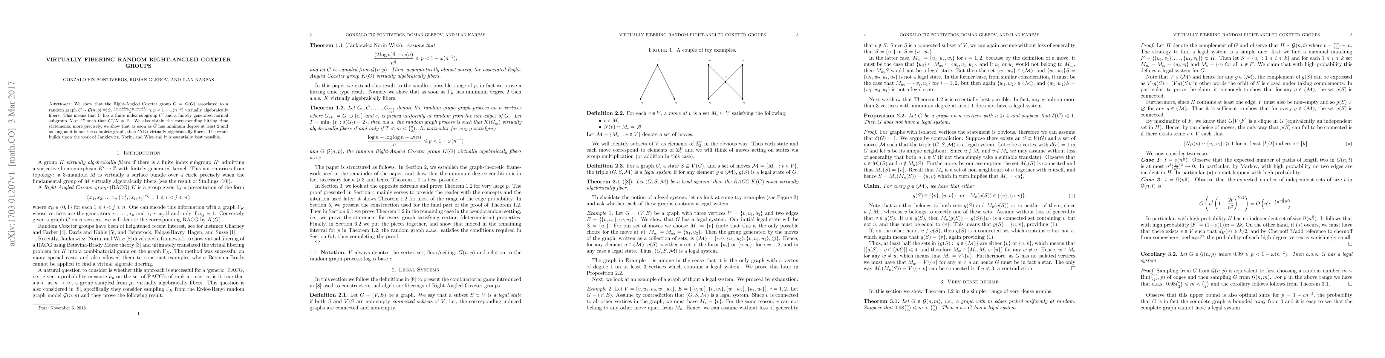 We show that the Right-Angled Coxeter group $C=C(G)$ associated to a random graph $G\sim \mathcal{G}(n,p)$ with $\frac{\log n + \log\log n + \omega(1)}{n} \leq p < 1- \omega(n^{-2})$ virtually algebraically fibers. This means that $C$ has a finite index subgroup $C'$ and a finitely generated normal subgroup $N\subset C'$ such that $C'/N \cong \mathbb{Z}$. We also obtain the corresponding hitting time statements, more precisely, we show that as soon as $G$ has minimum degree at least 2 and as long as it is not the complete graph, then $C(G)$ virtually algebraically fibers. The result builds upon the work of Jankiewicz, Norin, and Wise and it is essentially best possible.
