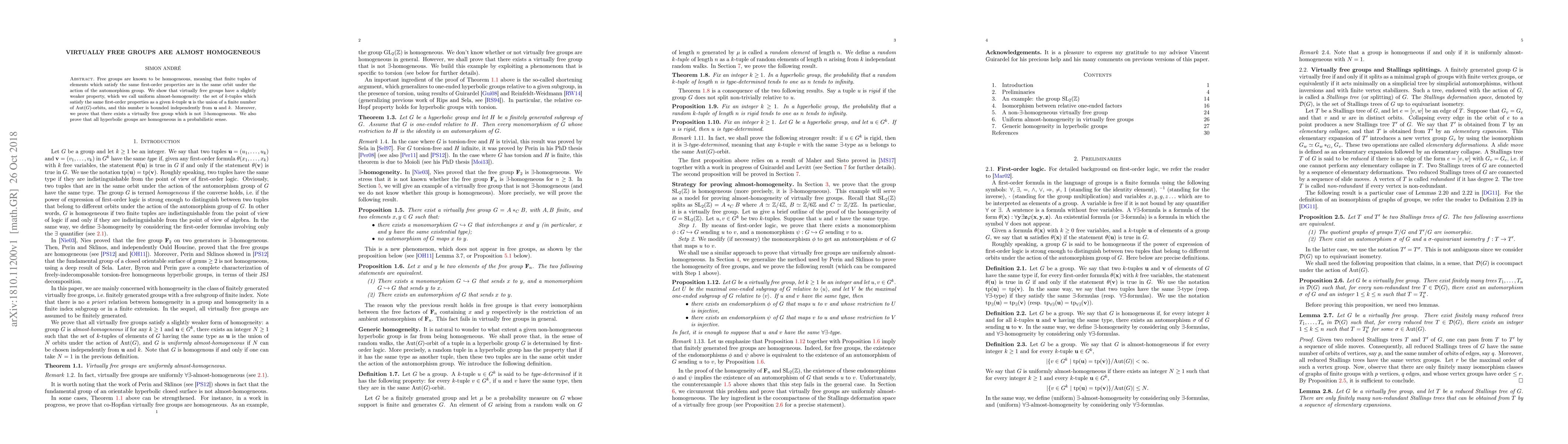 This paper demonstrates that virtually free groups exhibit a property called uniform almost-homogeneity, where $k$-tuples with the same first-order properties fall into a bounded number of automorphism orbits, though not necessarily all such groups are $\exists$-homogeneous. Additionally, it shows that all hyperbolic groups are homogeneous in a probabilistic sense.