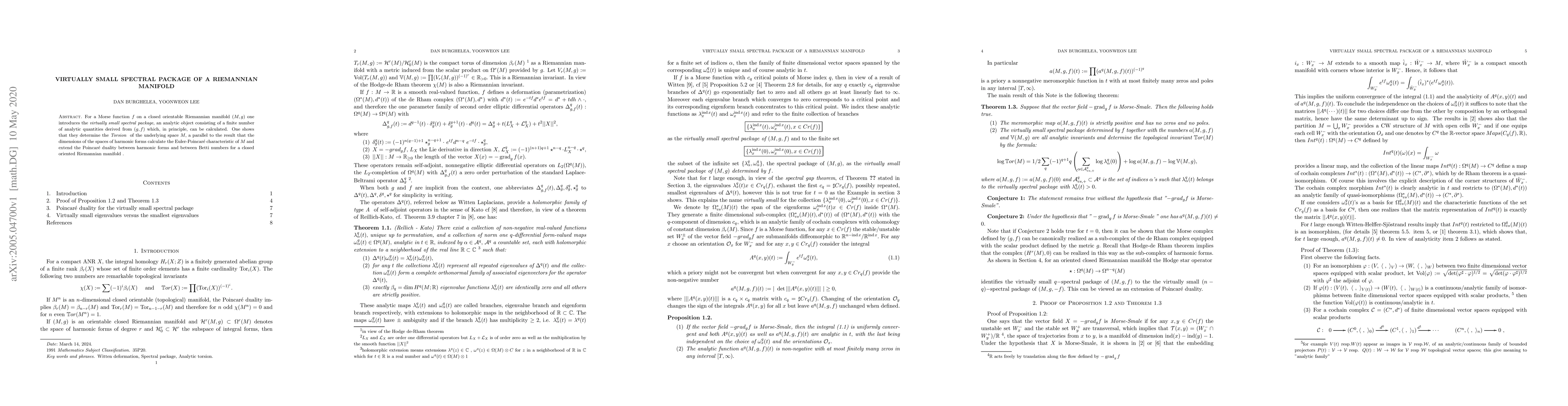 For a Morse function on a closed orientable Riemannian manifold one introduces the {\it virtually small spectral package} an analytic object consisting of a finite number of analytic quantities derived from the pair, {\it Riemannian metric, Morse function\} which, in principle, can be calculated. One shows that they determine the {\it Torsion } of the underlying space, a parallel to the result that the dimensions of the spaces of harmonic forms calculate the {\it Euler-Poincar\'e characteristic} of the underlying space and extends the {\it Poincar\'e Duality} between harmonic forms and between Betti numbers for a closed oriented Riemannian manifold .