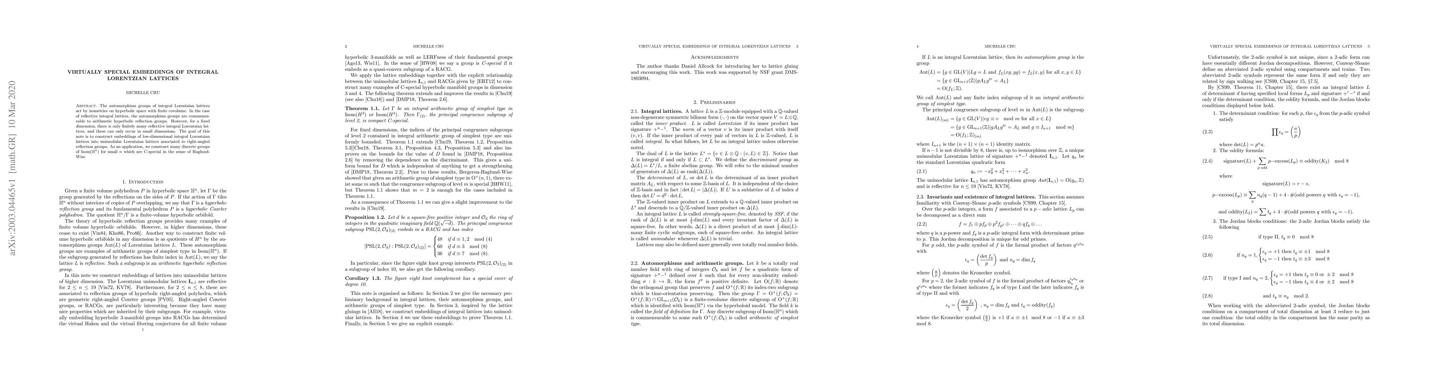 The automorphism groups of integral Lorentzian lattices act by isometries on hyperbolic space with finite covolume. In the case of reflective integral lattices, the automorphism groups are commensurable to arithmetic hyperbolic reflection groups. However, for a fixed dimension, there is only finitely many reflective integral Lorentzian lattices, and these can only occur in small dimensions. The goal of this note is to construct embeddings of low-dimensional integral Lorentzian lattices into unimodular Lorentzian lattices associated to right-angled reflection groups. As an application, we construct many discrete groups of $\mathrm{Isom}(\mathbb{H}^n)$ for small $n$ which are C-special in the sense of Haglund-Wise.