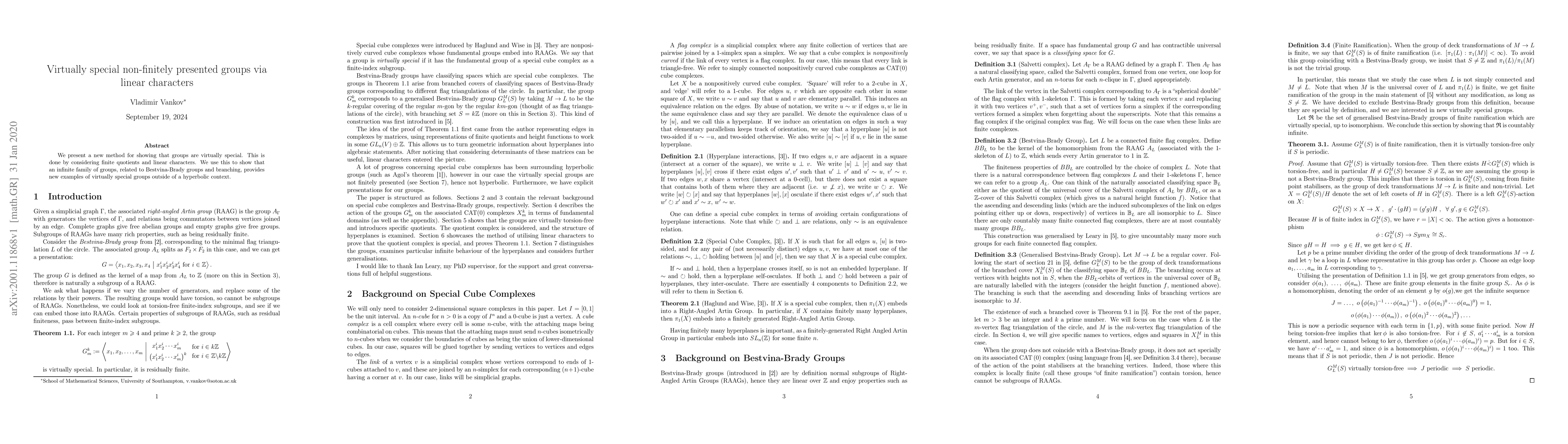 Summary: This paper introduces a novel method to demonstrate that certain groups are virtually special by examining finite quotients and linear characters, thereby providing new examples of virtually special groups beyond hyperbolic contexts, specifically related to Bestvina-Brady groups and branching.