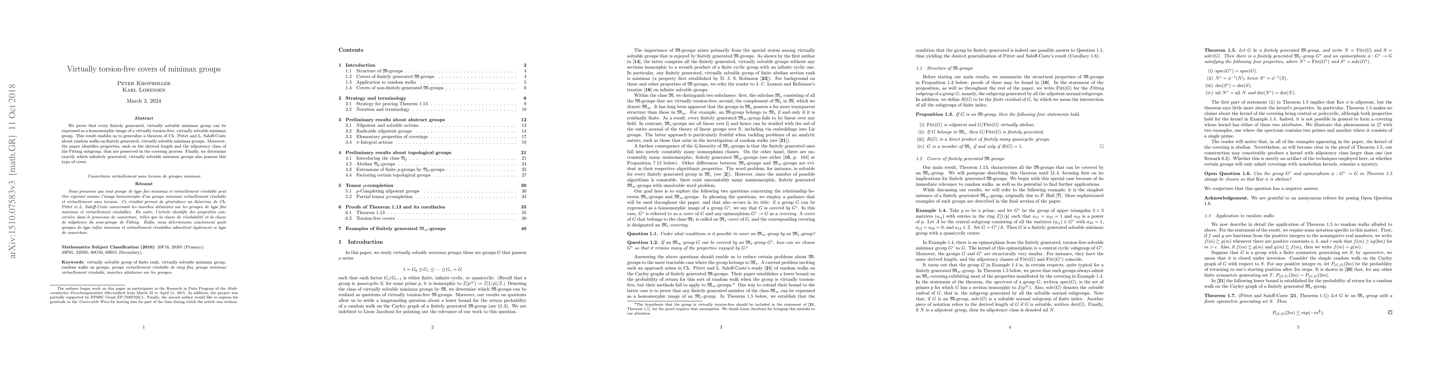 We prove that every finitely generated, virtually solvable minimax group can be expressed as a homomorphic image of a virtually torsion-free, virtually solvable minimax group. This result enables us to generalize a theorem of Ch. Pittet and L. Saloff-Coste about random walks on finitely generated, virtually solvable minimax groups. Moreover, the paper identifies properties, such as the derived length and the nilpotency class of the Fitting subgroup, that are preserved in the covering process. Finally, we determine exactly which infinitely generated, virtually solvable minimax groups also possess this type of cover.
