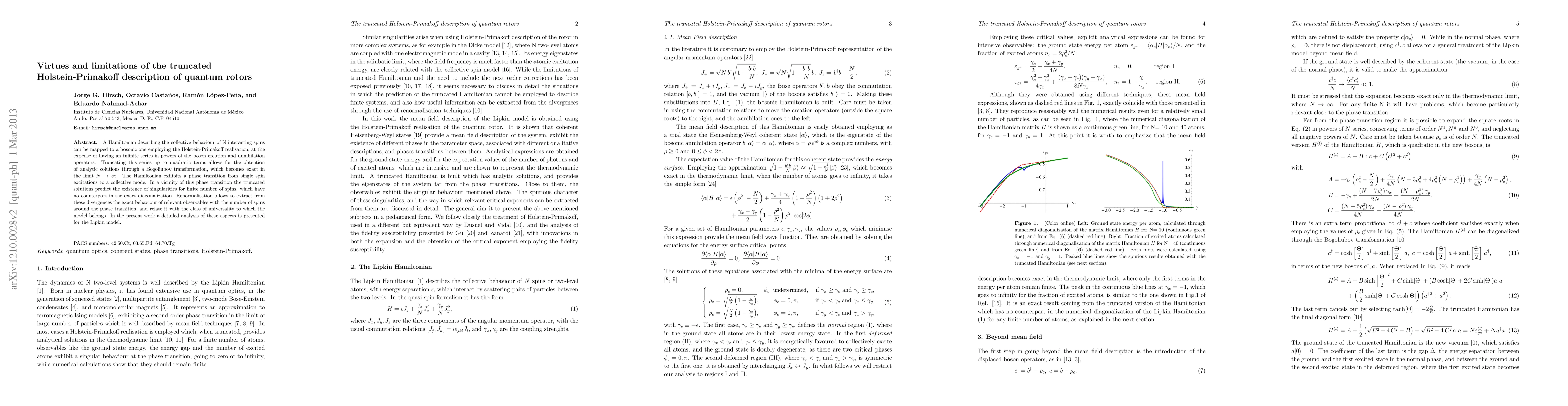 A Hamiltonian describing the collective behaviour of N interacting spins can be mapped to a bosonic one employing the Holstein-Primakoff realisation, at the expense of having an infinite series in powers of the boson creation and annihilation operators. Truncating this series up to quadratic terms allows for the obtention of analytic solutions through a Bogoliubov transformation, which becomes exact in the limit N -> infinit. The Hamiltonian exhibits a phase transition from single spin excitations to a collective mode. In a vicinity of this phase transition the truncated solutions predict the existence of singularities for finite number of spins, which have no counterpart in the exact diagonalization. Renormalisation allows to extract from these divergences the exact behaviour of relevant observables with the number of spins around the phase transition, and relate it with the class of universality to which the model belongs. In the present work a detailed analysis of these aspects is presented for the Lipkin model.