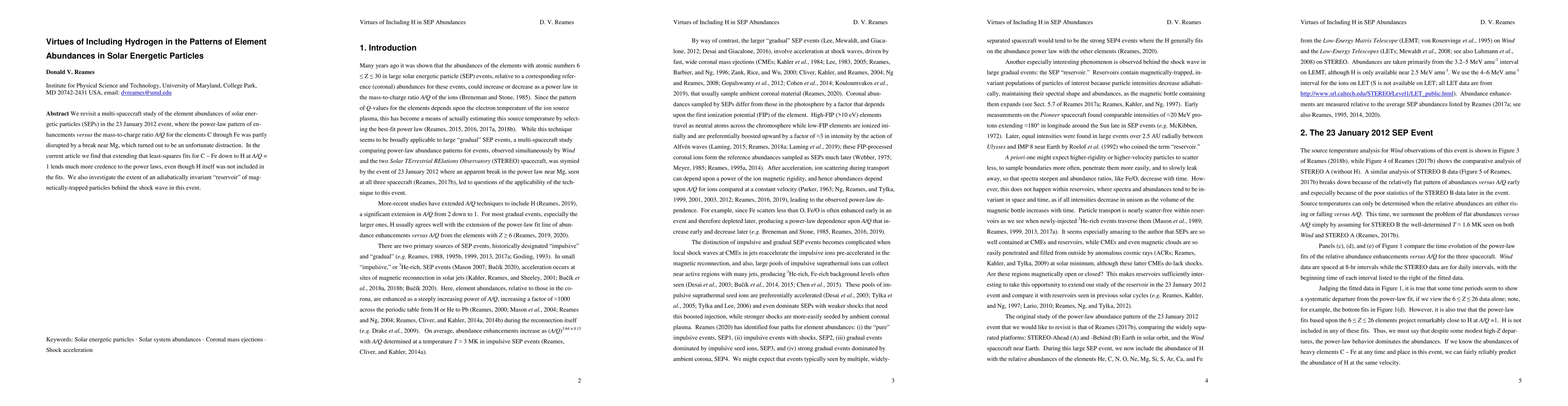 This paper examines the element abundances in solar energetic particles from the 23 January 2012 event, finding that including hydrogen in the analysis enhances the credibility of power-law patterns for elements C through Fe, despite hydrogen not being directly fitted. It also explores the magnetically-trapped particle reservoir behind the shock wave.