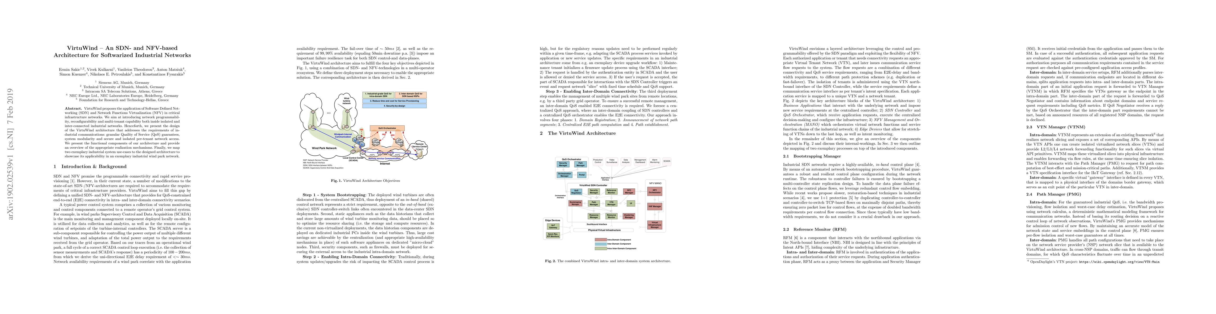 VirtuWind proposes the application of Software Defined Networking (SDN) and Network Functions Virtualization (NFV) in critical infrastructure networks. We aim at introducing network programmability, reconfigurability and multi-tenant capability both inside isolated and inter-connected industrial networks. Henceforth, we present the design of the VirtuWind architecture that addresses the requirements of industrial communications: granular Quality of Service (QoS) guarantees, system modularity and secure and isolated per-tenant network access. We present the functional components of our architecture and provide an overview of the appropriate realization mechanisms. Finally, we map two exemplary industrial system use-cases to the designed architecture to showcase its applicability in an exemplary industrial wind park network.
