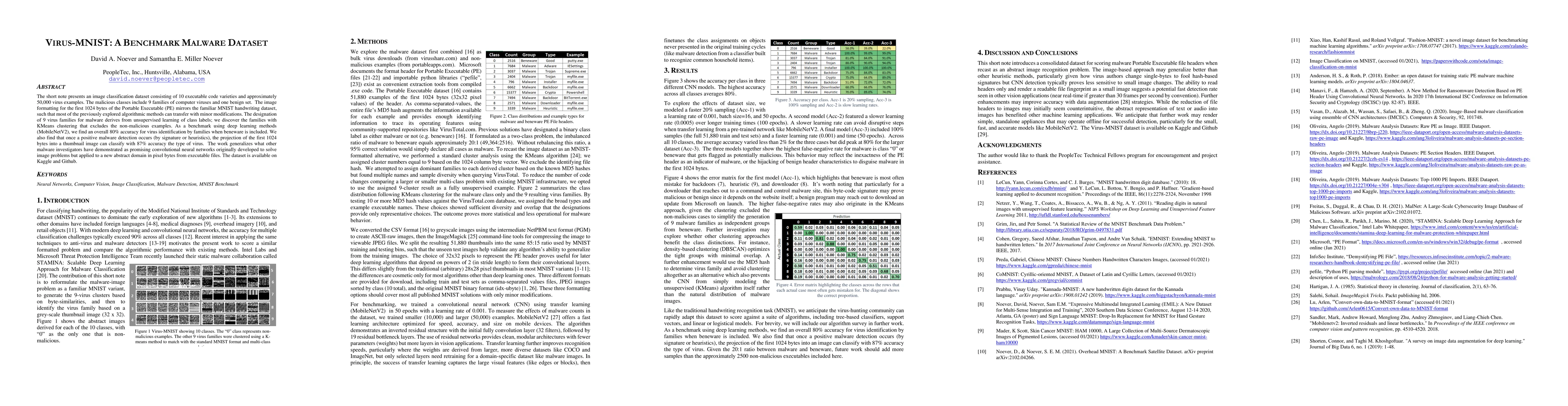 The Virus-MNIST dataset presents 50,000 executable code examples from 10 classes, including 9 virus families and 1 benign set, formatted as images of their first 1024 bytes. Using deep learning (MobileNetV2), the dataset achieves 80% accuracy in identifying virus families, demonstrating the effectiveness of convolutional neural networks in malware classification.