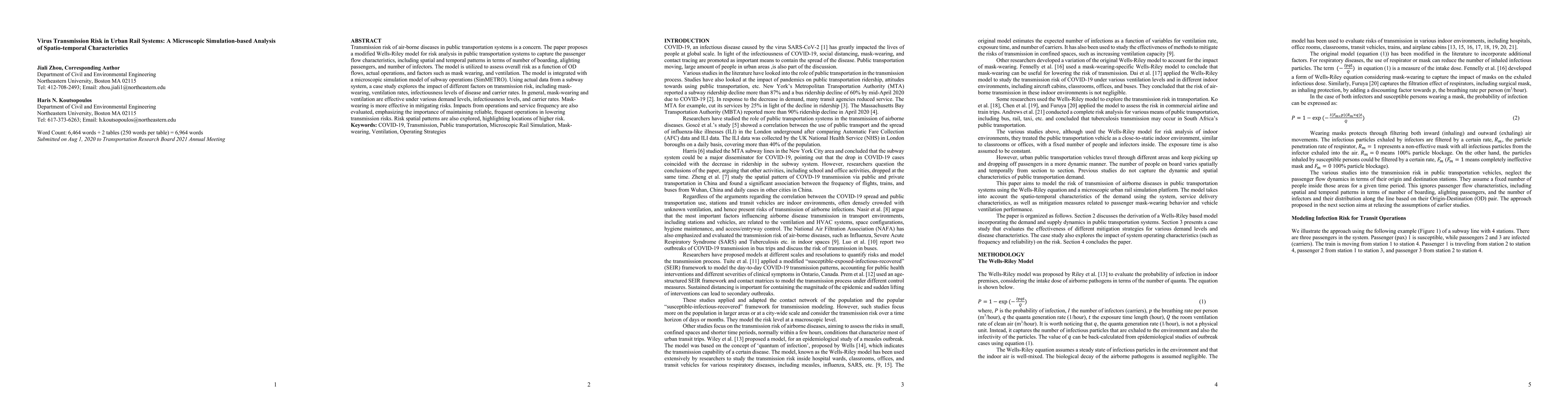 This paper develops a modified Wells-Riley model integrated with a microscopic simulation to analyze virus transmission risks in urban rail systems, finding that mask-wearing and ventilation significantly reduce risk, while reliable, frequent service operations are crucial for mitigating transmission.