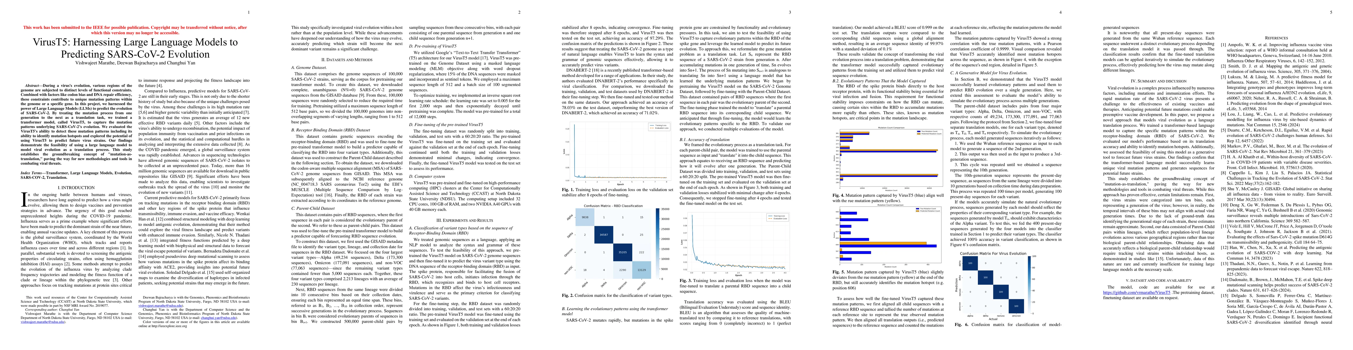 This paper introduces VirusT5, a transformer model using Large Language Models to predict SARS-CoV-2 evolution by modeling mutation as a translation task. The study demonstrates VirusT5's capability to identify mutation patterns, hotspots, and future variants, highlighting a novel "mutation-as-translation" approach for viral evolution modeling.
