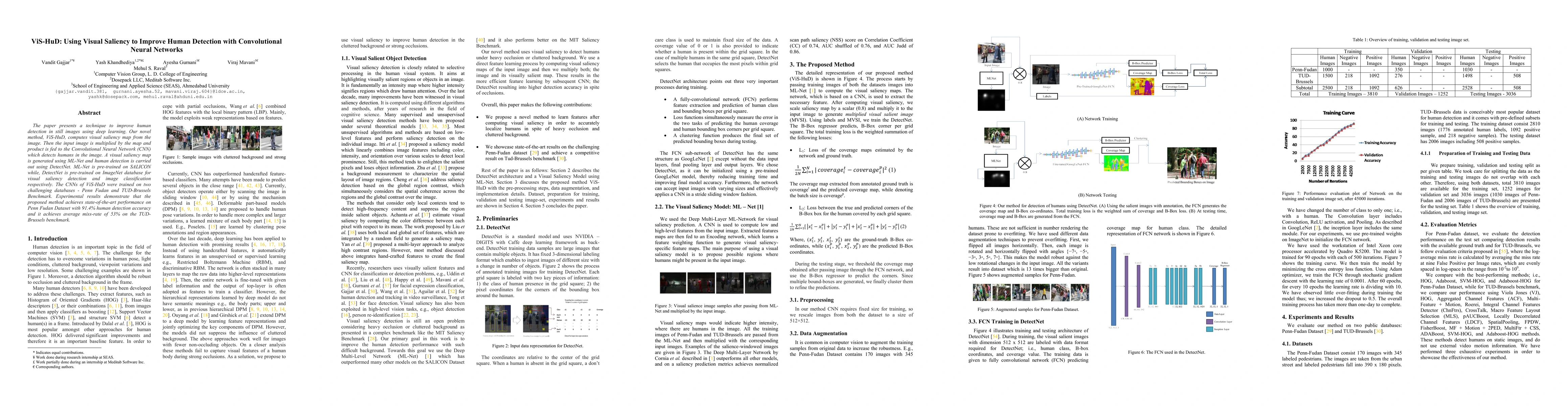 The paper introduces ViS-HuD, a method that enhances human detection in still images using convolutional neural networks by incorporating visual saliency maps. The technique multiplies the saliency map with the input image before feeding it to the CNN, achieving state-of-the-art performance with 91.4% accuracy on the Penn Fudan Dataset and a 53% miss-rate on the TUD-Brussels Benchmark.
