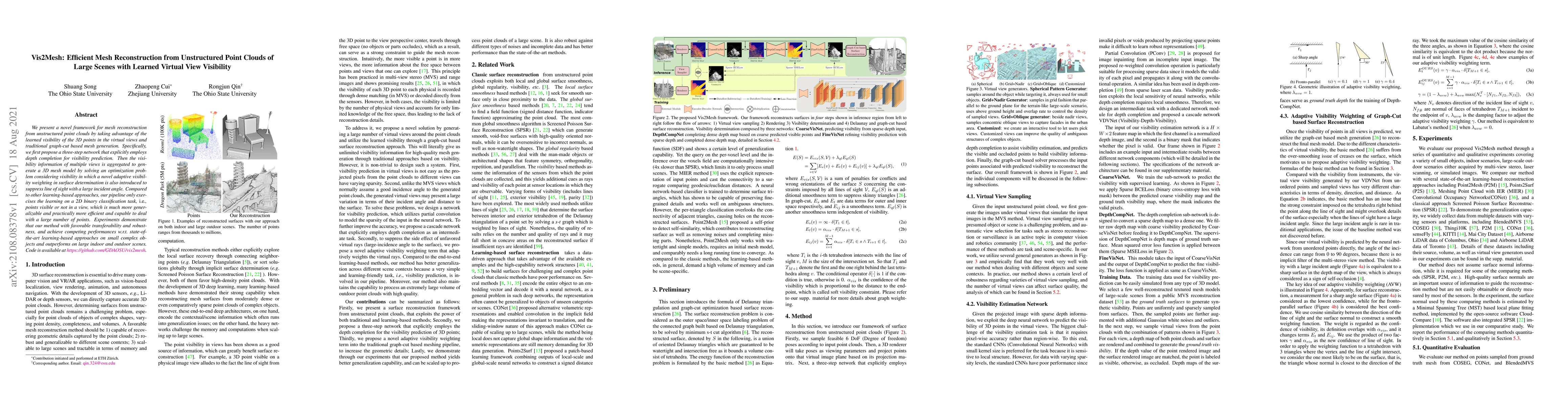 This paper introduces Vis2Mesh, a framework for efficient mesh reconstruction from unstructured point clouds using learned virtual view visibility and graph-cut based mesh generation. The method employs a three-step network for depth completion and visibility prediction, followed by adaptive visibility weighting to generate a robust 3D mesh model, demonstrating competitive performance on large scenes.